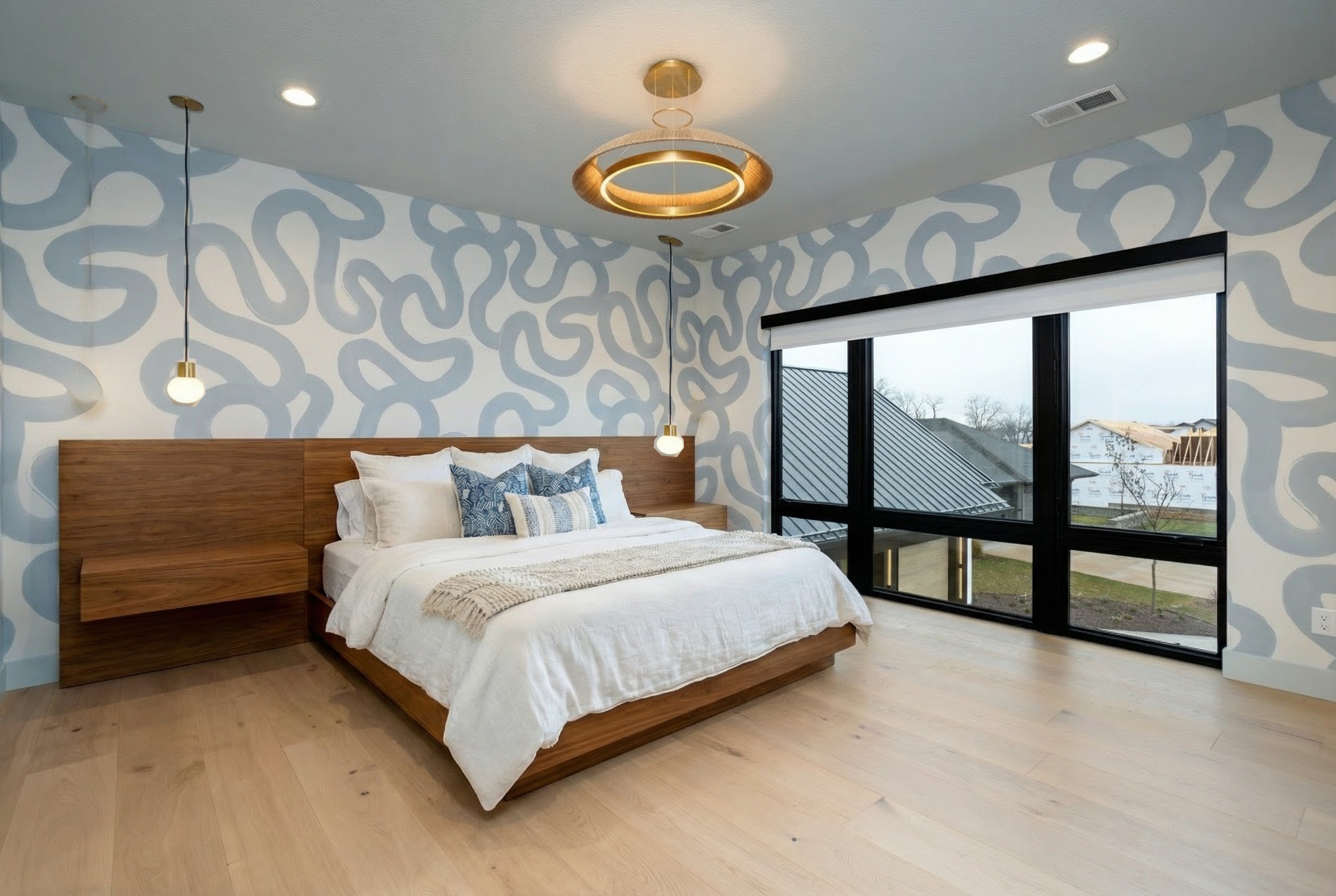 please add a rug below the bed and make the sconces look more realistic get rid of the photoshop marks
