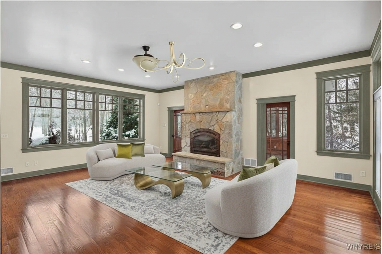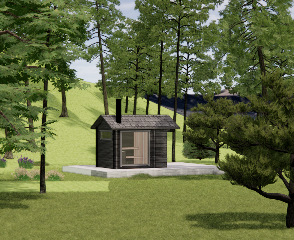 render a photorealistic 3d perspective of this house the current material style keep model geometry the same windows doors roof walls make a green meadow with moss gray several pine trees around looks native to swedsih forest do not change relief do not change the view only enhance the current materials and make the landscape nicer vegetation detailed textures in the wood siding and a vibrant clear sky with light atmospheric depth render in hyper realistic architectural visualization quality 8k resolution