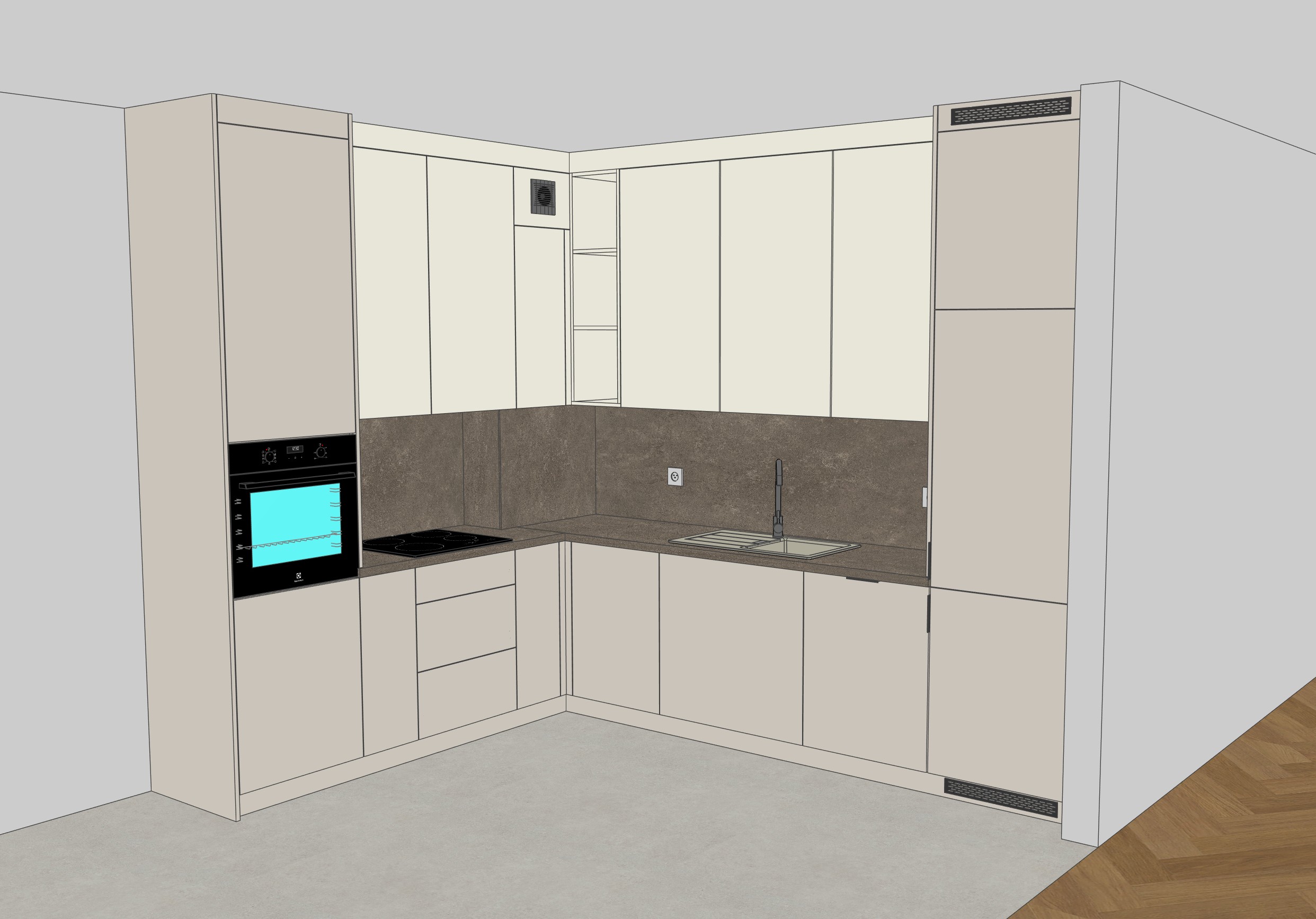 create a render in hyper realistic architectural visualization quality 8k resolution all cabinets appliances vent grilles outlets shelves and fixtures must remain exactly in place do not add or delete any objects from the image the spatial configuration must remain unchanged soft natural daylight from the left gentle shadows smooth matte surfaces on cabinet fronts subtle sheen on the stone countertop and backsplash the upper wall cabinets are a lighter almost white cream tone the lower base cabinets and tall columns are a warmer darker cashmere beige preserve this two tone color difference exactly as shown in the input image the countertop and backsplash are grey marble with warm beige veining use pure white matte walls use light grey concrete look floor tiles maintain color precision from the source image