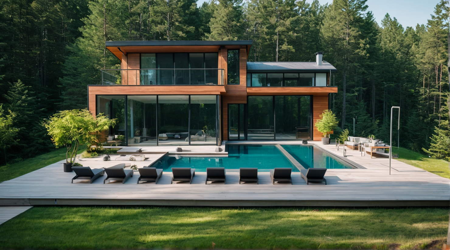 add flower beds and a driveway with a car in it beside house also add trees add potted plants around the pool