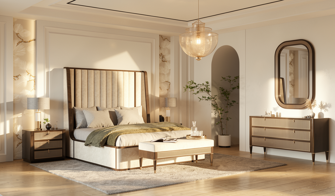 add two symmetrical minimalist chinese inspired bronze totems placed on both sides of the central door the totems should be tall and slender approximately 1 4 1 6 meters sculptural contemporary reinterpretation of traditional chinese ritual bronze forms brushed dark bronze finish with subtle warm undertones matte surface soft realistic reflections clean geometric silhouette refined proportions minimal detailing inspired by ancient chinese bronze geometry the totems must be perfectly aligned and symmetrically positioned against the wooden slat wall maintaining architectural balance do not modify anything else in the scene keep the lighting materials camera angle composition colors textures and all existing elements exactly as they are no changes to exposure contrast shadows furniture wall panels flooring or artwork only add the two bronze totems high realism physically accurate materials natural integration with existing light subtle shadows cast on the wall architectural visualization quality