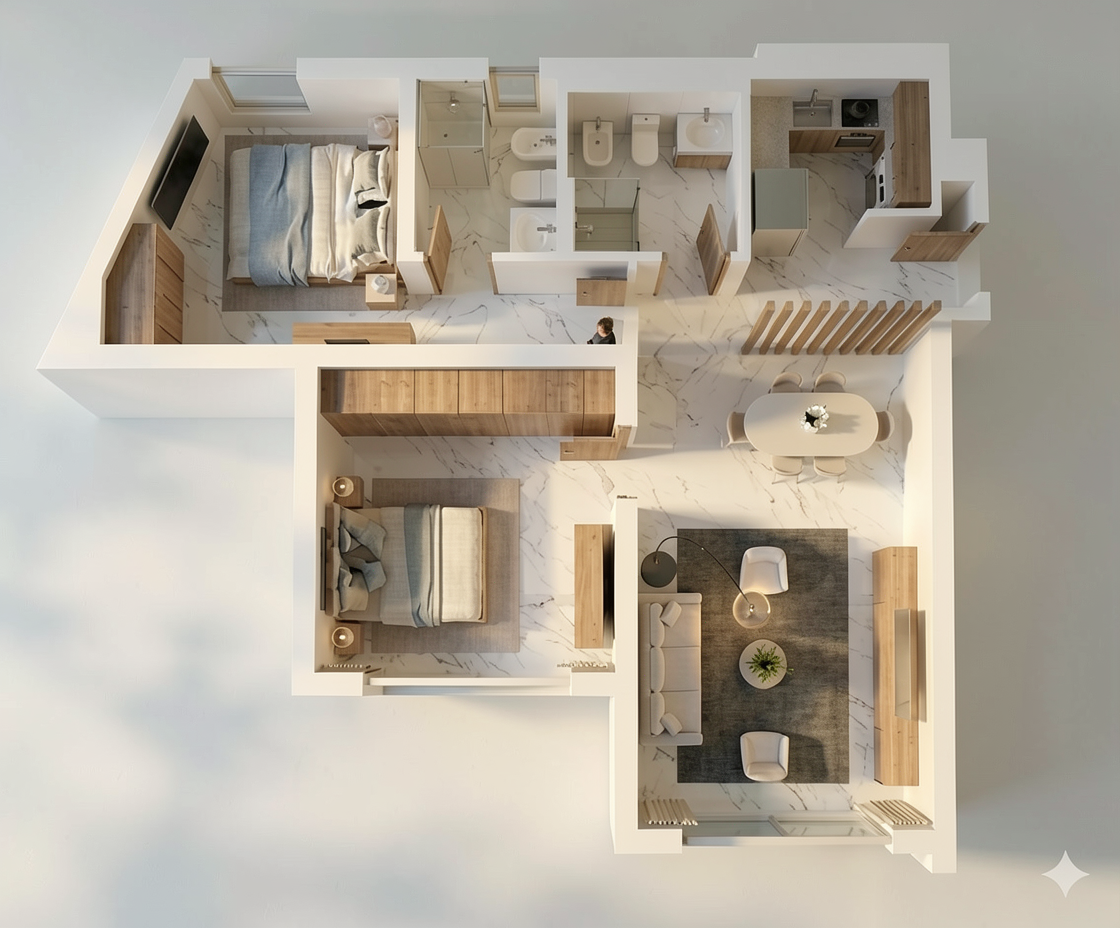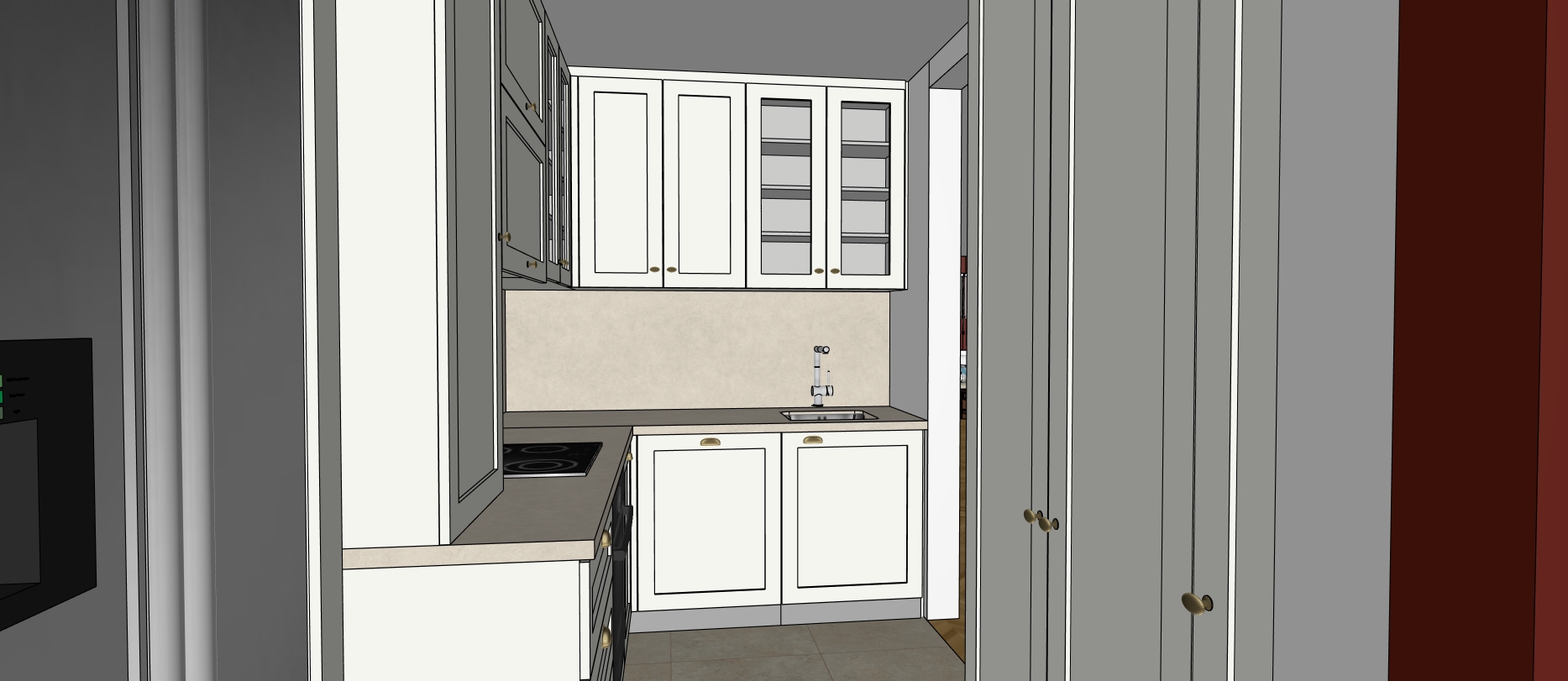 kitchen elements in a warm white shade of color with golden handles on the upper elements there is a glass door on the right side next to the wall and three shelves are visible through the glass the shelves are made of panels in a warm white color the left part of the upper elements are with a panel in a warm gray color kitchen worktop and the surface of the wall behind the worktop in the same material beige stone put flowers and decor on the work surface put plates glasses bowls in the part of the element with glass doors