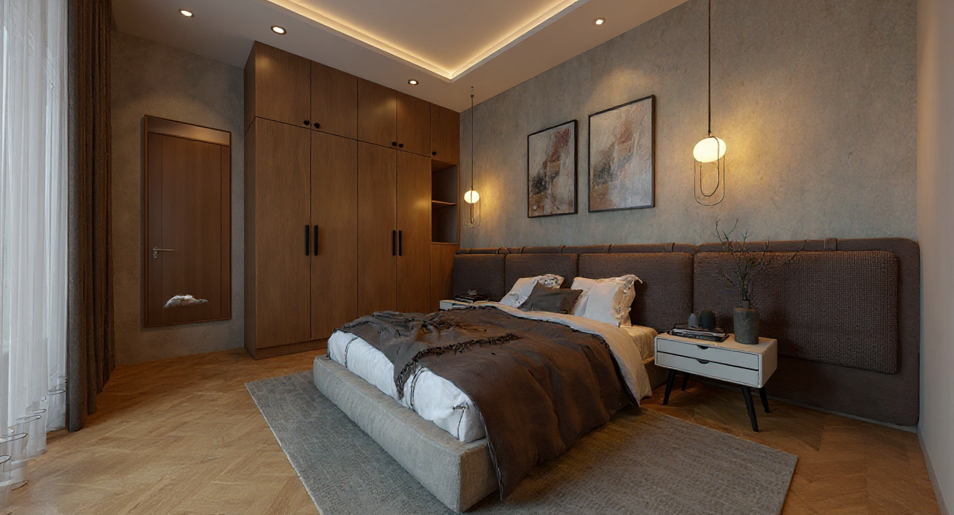 modernist interior shot modern luxury kitchen interior render full view sleek minimalist design with matte beige tall cabinets integrated wooden open shelves with warm led strip lighting marble island and backsplash with strong natural veins hidden handles built in lighting contemporary faucet clean lines high end materials photorealistic rendering architecture