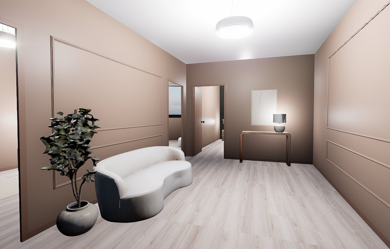 modernist interior shot the image shows a minimalist and elegant interior probably a living room or entryway designed in warm beige and light brown tones key elements walls the walls feature a classic design with decorative moldings painted in a soft brown tone sofa a modern curved sofa in white or cream is placed against a wall decorative plant a plant in a gray ceramic pot is placed to the left of the sofa adding a natural accent to the space console in front of the sofa is a simple wooden console that holds a decorative vase and a lamp with shade mirror or artwork a rectangular mirror or simple artwork is hung above the console table floor the floor is finished with a light wood like material creating a bright and welcoming atmosphere doors several doors at the back lead to other rooms and natural light seems to enter from a window in an adjacent space translated with deepl com free version architecture