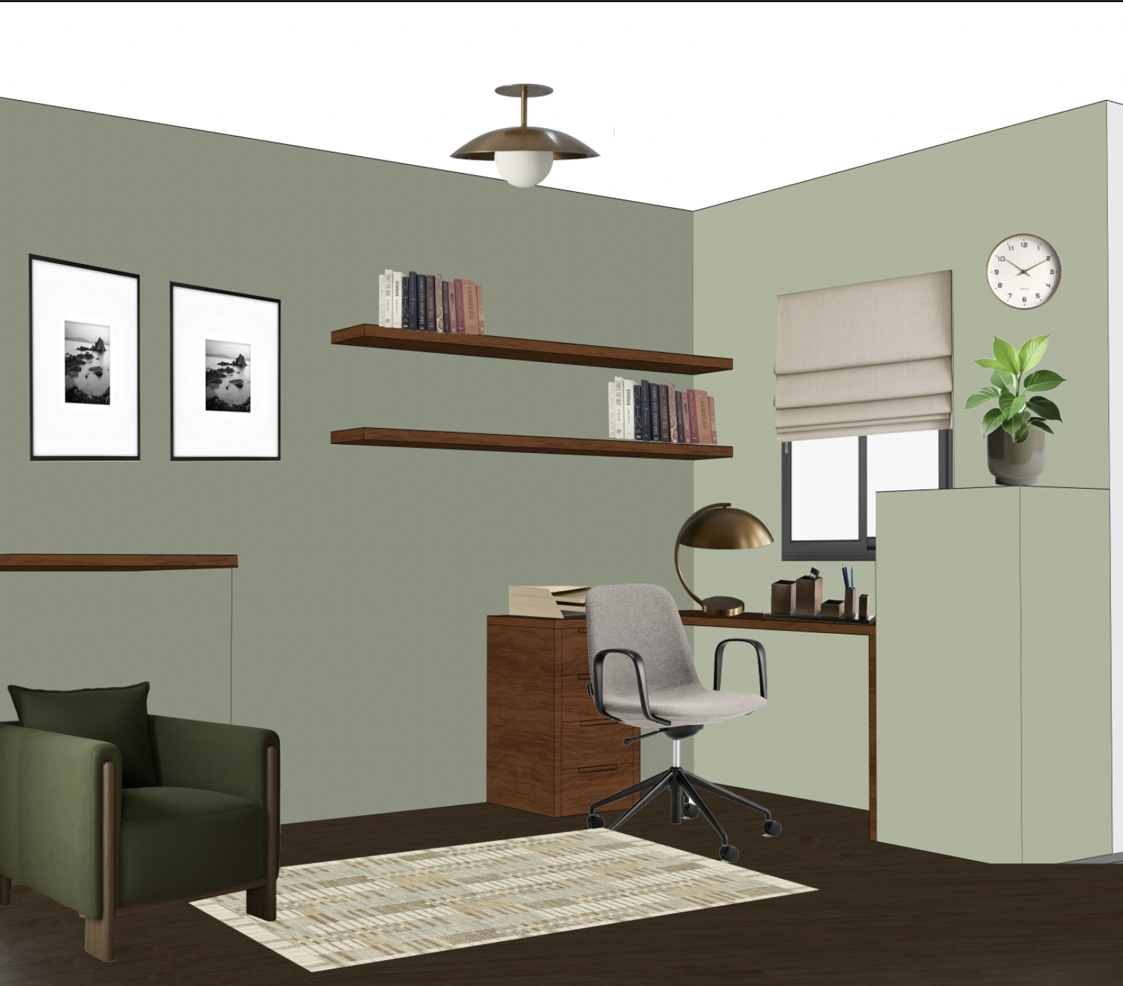 render my image add light source to ceiling light and desk light add a small handle to the built in unit on the right