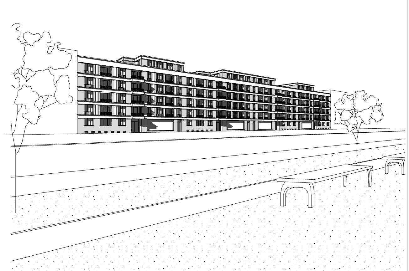 render a modern apartment complex with five floors featuring a sleek design use a soft gray for the building facade accented with dark slate balconies and trim the windows should have a reflective glass finish introduce lush green trees on either side with vibrant green foliage the ground area is paved with light beige tiles interspersed with small patches of green grass include white benches in the foreground the atmosphere should be calm and inviting under a clear blue sky with soft fluffy clouds architecture