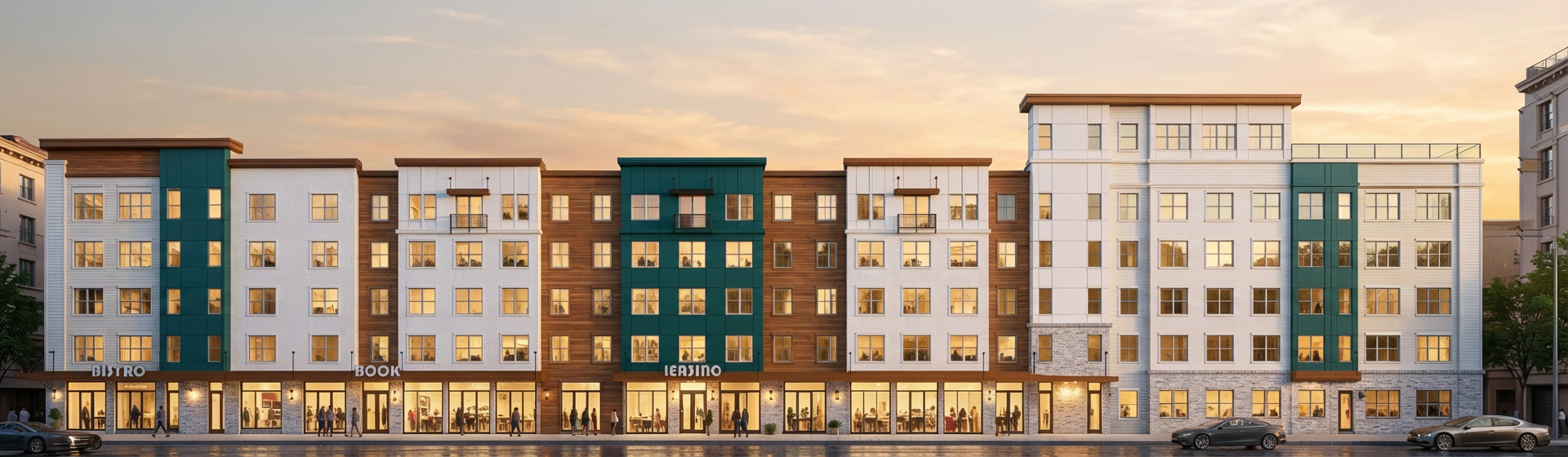 back view of a clean modern architectural exterior rendered in cinematic vibrant golden hour lighting with blue skies mountain modern with heavy timber architectural style stone natural wood siding beautifully lush green manicured landscape around structure with hedges and gardens black standing seam metal roof prominent cinematic sprawling winery in the far distance with big douglas fir trees surrounding the house in the background with this house in the foreground high fidelity photorealistic visualization crisp shadow falloff refined facade geometry soft atmospheric depth premium architectural photography mood ultra clean composition and materials dark trim around windows big wood truss
