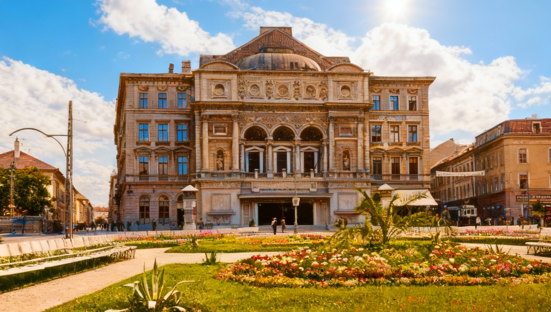 sunny day beautyful clouds restored and repaired fa ades cinematic view left and right facade illuminated bright picture