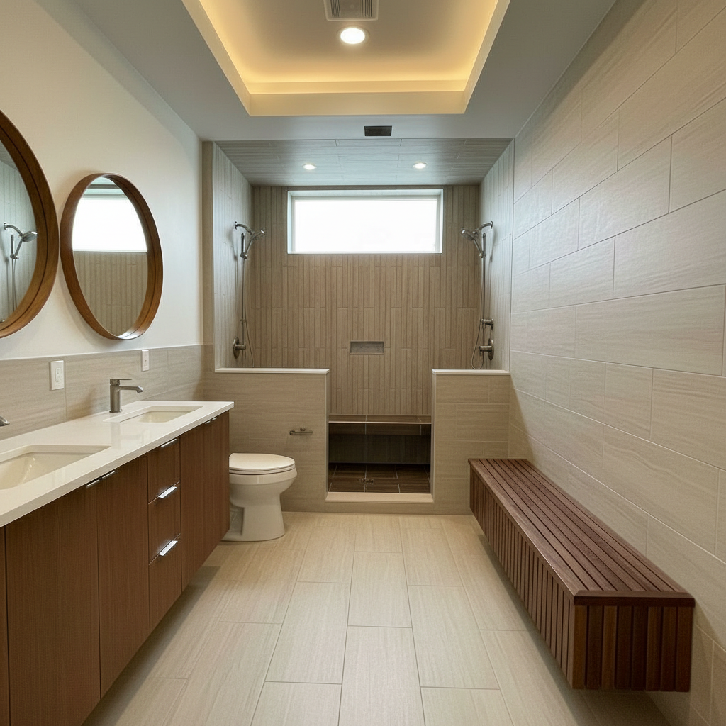 modernist interior shot do not change anything on this render except what i say below do not reimagine this render unless i tell you to only change what i tell you to change after this colon remove recessed light from cove ceiling do not change anything else on this render replace tile on the right wall venetian plaster there is no on the left wall of the shower architecture