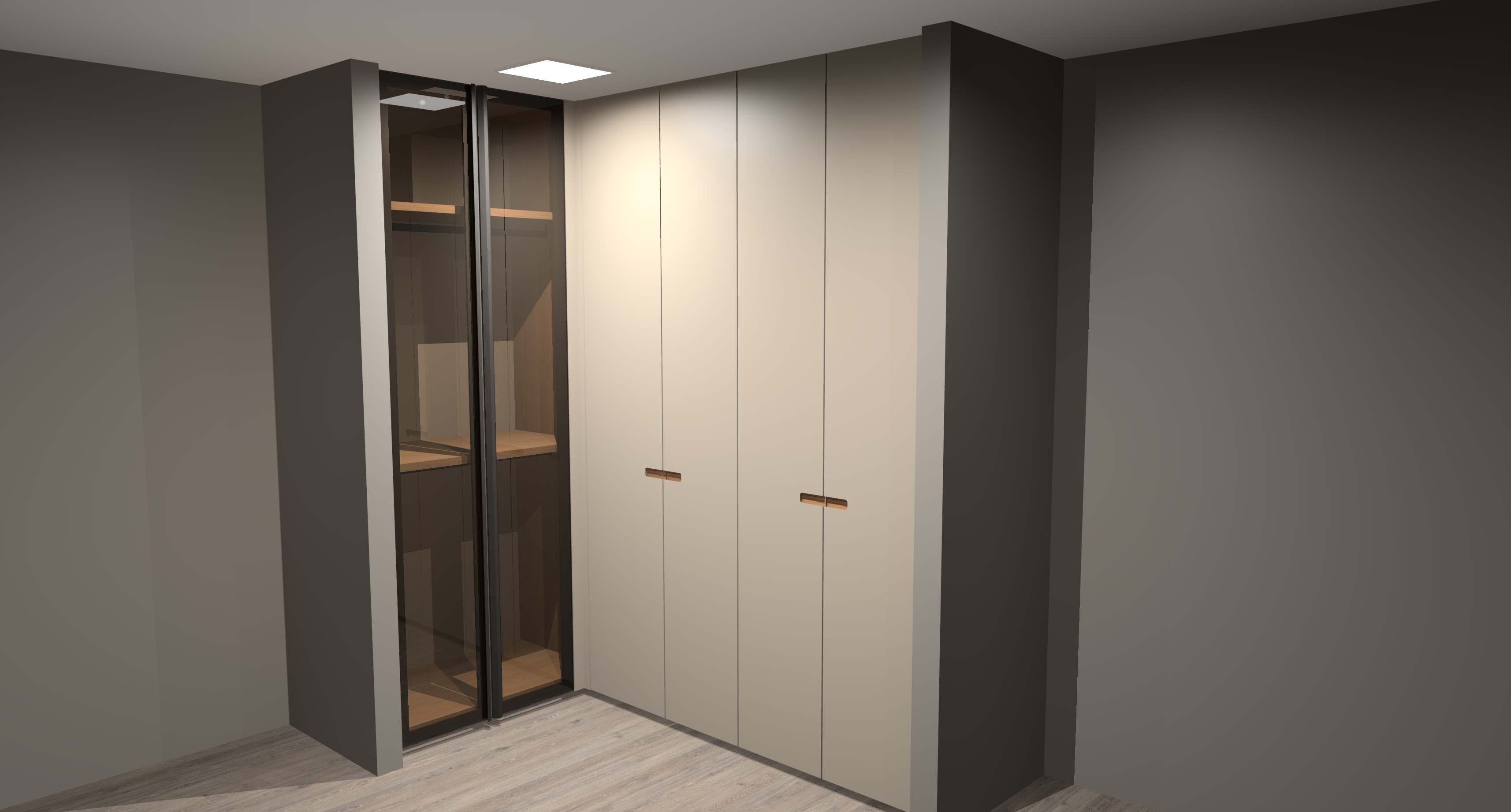 armario acabado laca mate vis n claro combinado con puertas en cristal interiores en madera natural con ropa variada suelo en madera natural nogal claro