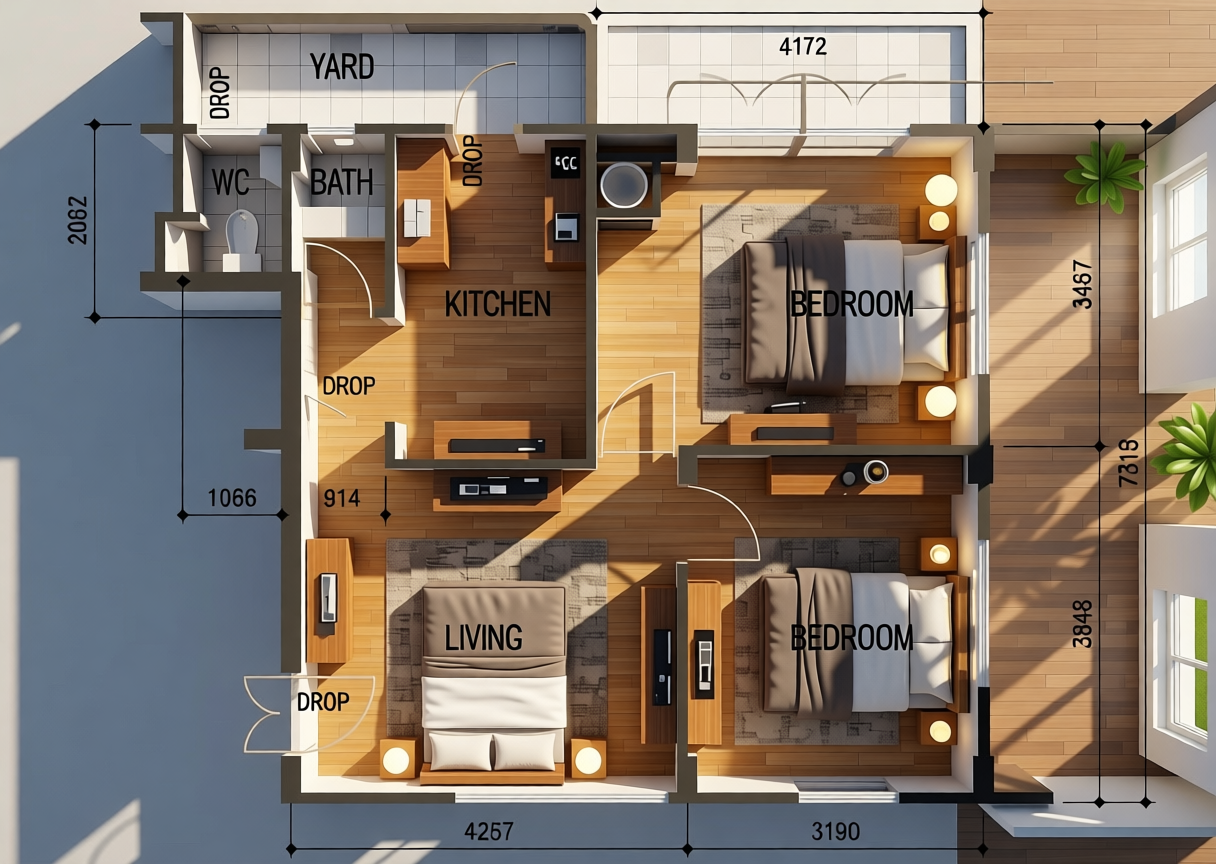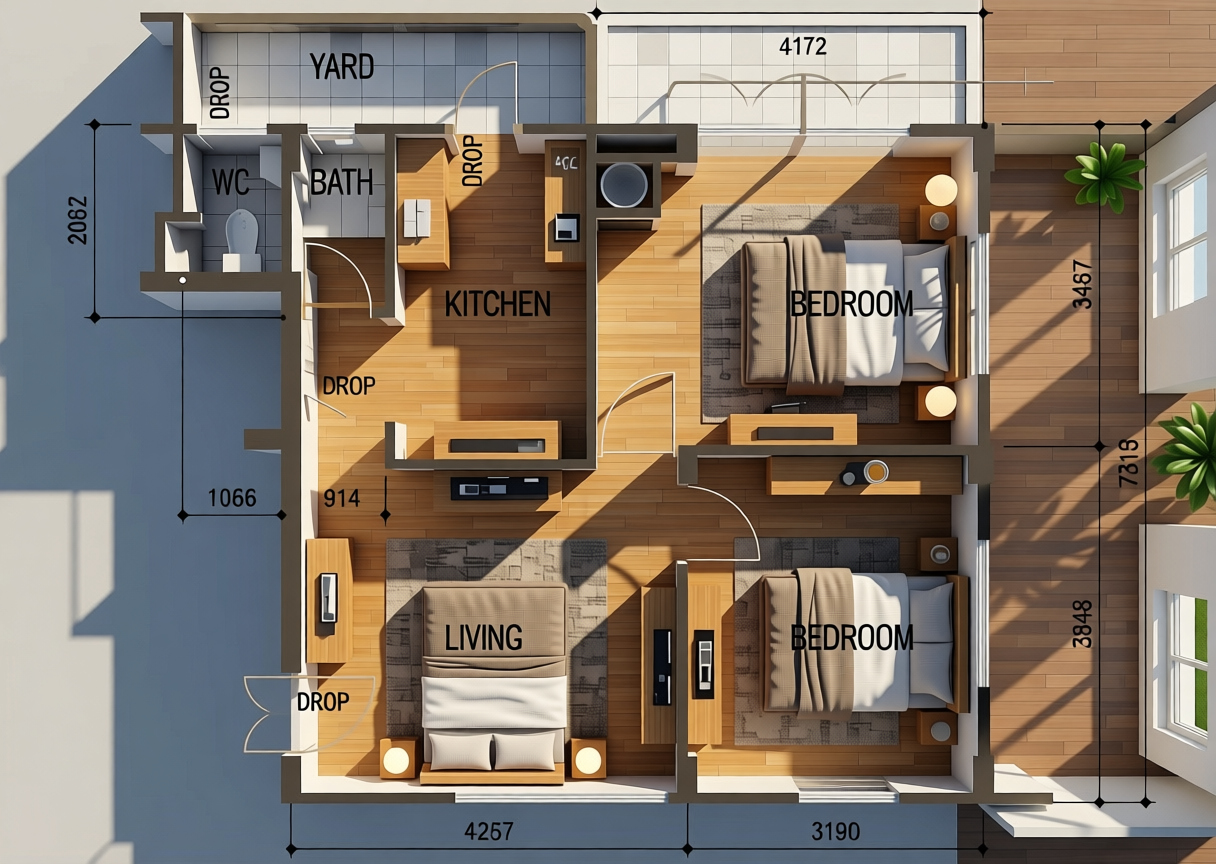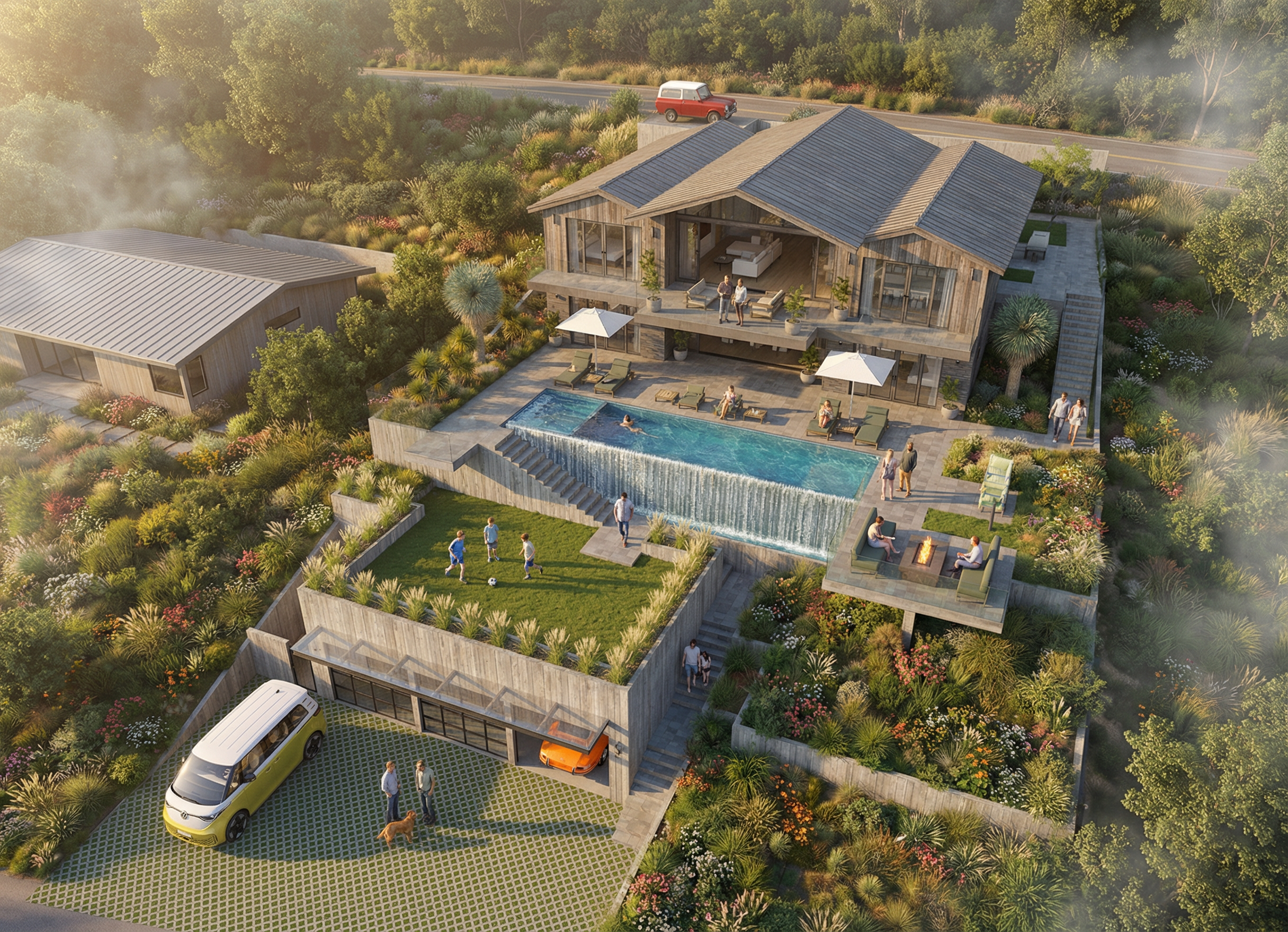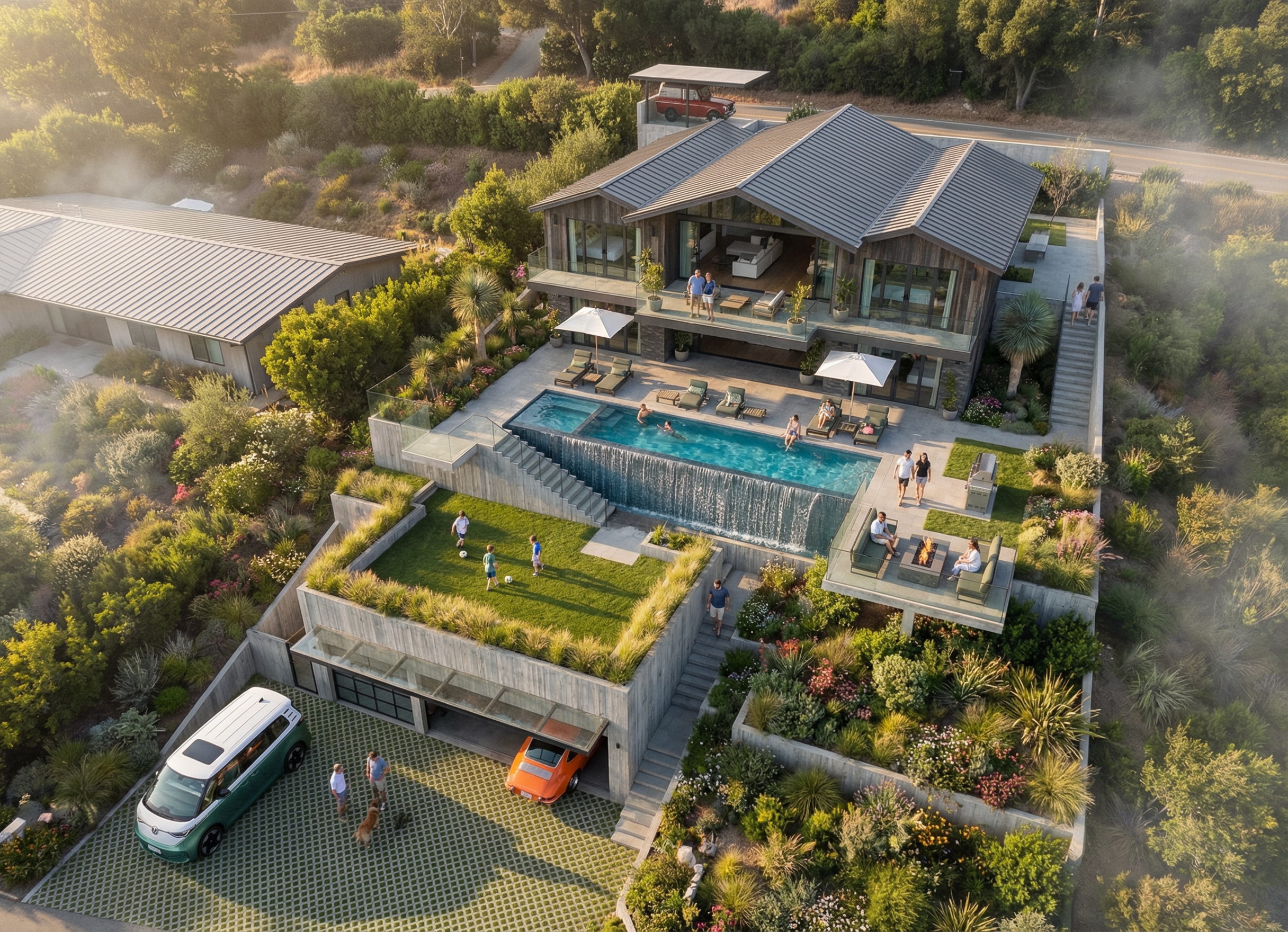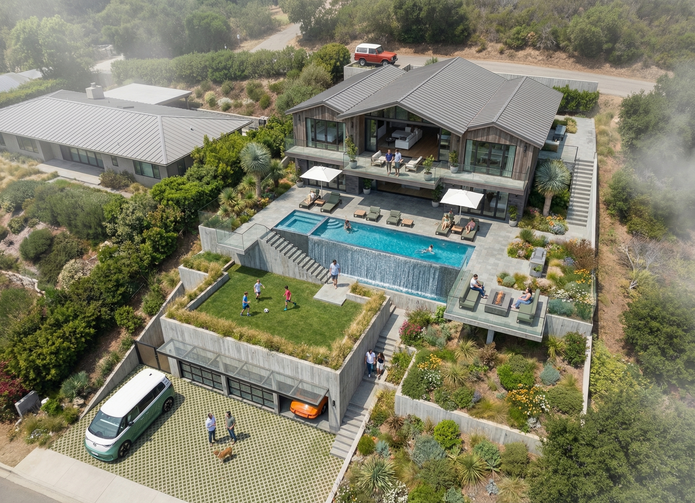 add clumps or groupings of california native plants and flowers to the yard areas with grass in between enhance the waterfall effect at the infinity edge of the swimming pool along the full length of the pool add a 2025 model vw buzz parked in the driveway on the left side make the entire driveway surface grasscrete with an asphalt road at the bottom of it with a natural looking transition between the asphalt and grasscrete add 3 children playing with a soccer ball on the lawn above the garage add people around the pool and swimming in the pool add just one man and one woman walking up the stairs on the right side of the garage add groupings of bushes and trees to the adjacent landscape like the area around malibu lake with wild grasses in between add a man and a woman looking out from the center of the balcony at the upper level of the house enhance the roadway at the upper level of the view to make it look more realistic make it one lane wide and partially obscure it with bushes and trees open up the right side garage door and add an orange colored 1972 porsche 911 parked halfway inside the garage add 2 men on the driveway talking to each other with a medium sized dog sitting next to them add a small modest sized ranch style modern home with a low pitched metal roof on the adjacent parcel on the far left side of the view and partially obscure it with trees and plants and a little fog the planter along the outer edge of the garage walls keep the type of grass that is already in the view add a man and woman sitting facing the fire pit on the right sofa add some weathering effect to the board formed concrete material of the garage walls and other retaining walls add a little fog effect to the right side of the view on the adjacent land use the original image vertical 4 wood siding as a reference and enhance the look of the material keep the lawn area and two trees at the right side on the same level as the pool from the original image the house has a standing seam metal roof