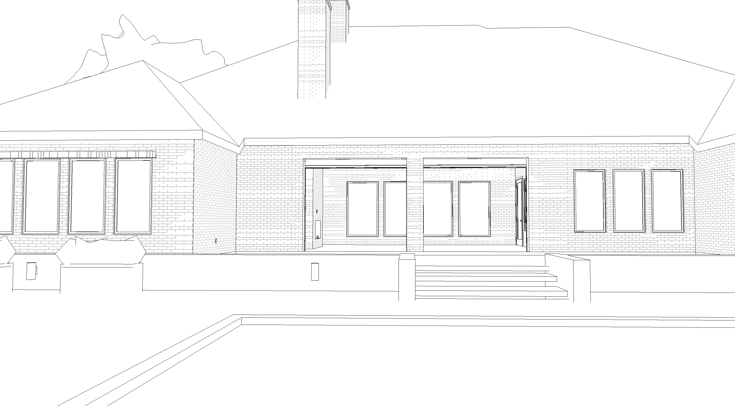 dark red and brown bricks black windows black roof black trim travertine retaining wall and deck over casted day warm lights wet deck