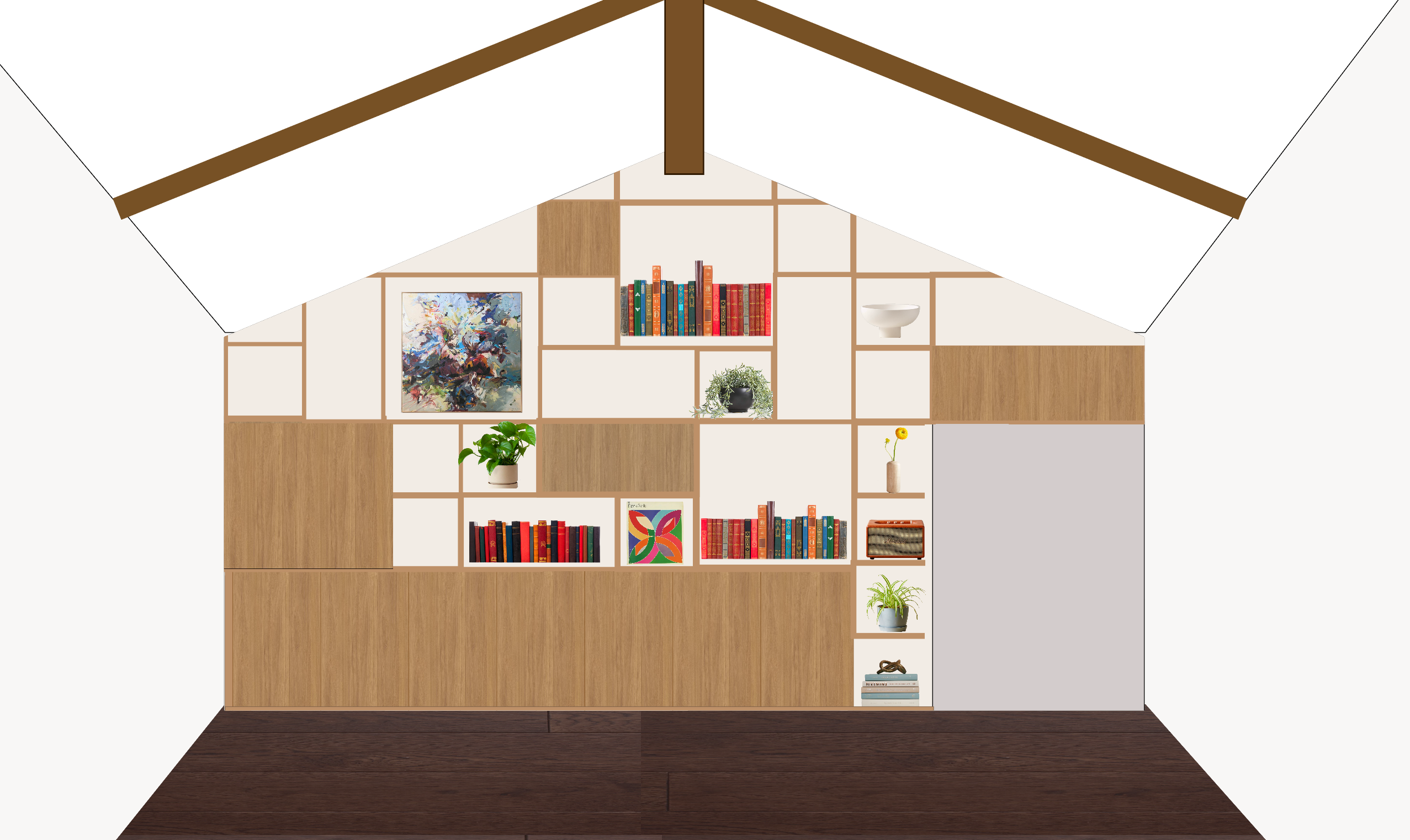 the right grey rectangle is an entry into the kitchen do not add sky lights add wood wall paneling behind remove wood panels on far right side of wall remove grey trim around entry door extend the paneling and shelves across the entire wall and above the entry to mimc the image