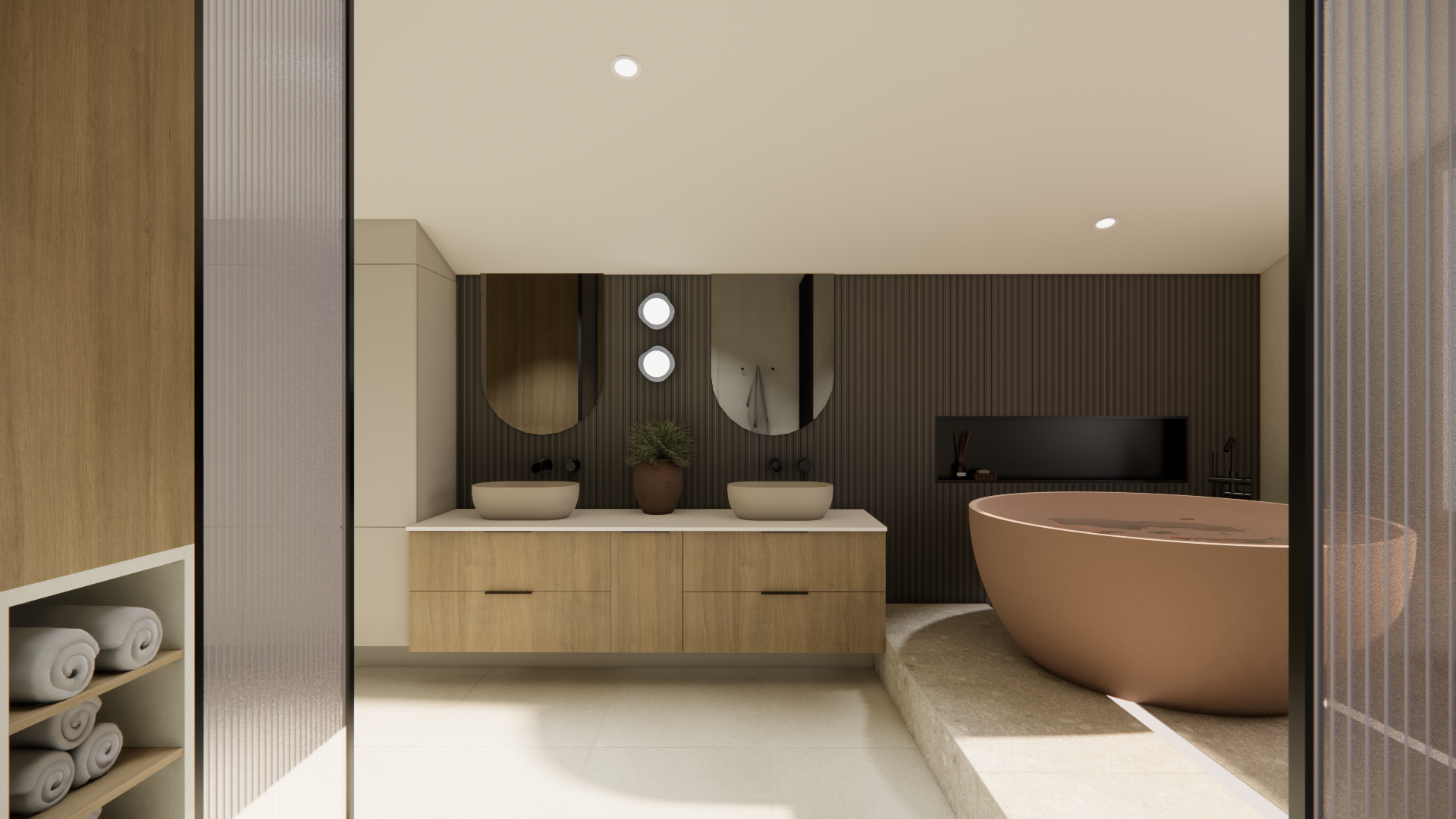 contemporary interior shot add a warm wooden accent wall behind the bathtub in natural oak tones keep the sculptural bathtub and black fixtures add a floating wood vanity with a round backlit mirror integrate warm indirect led lighting 3000k in the shower niches and behind the mirror spa like atmosphere natural materials modern yet cozy style architecture