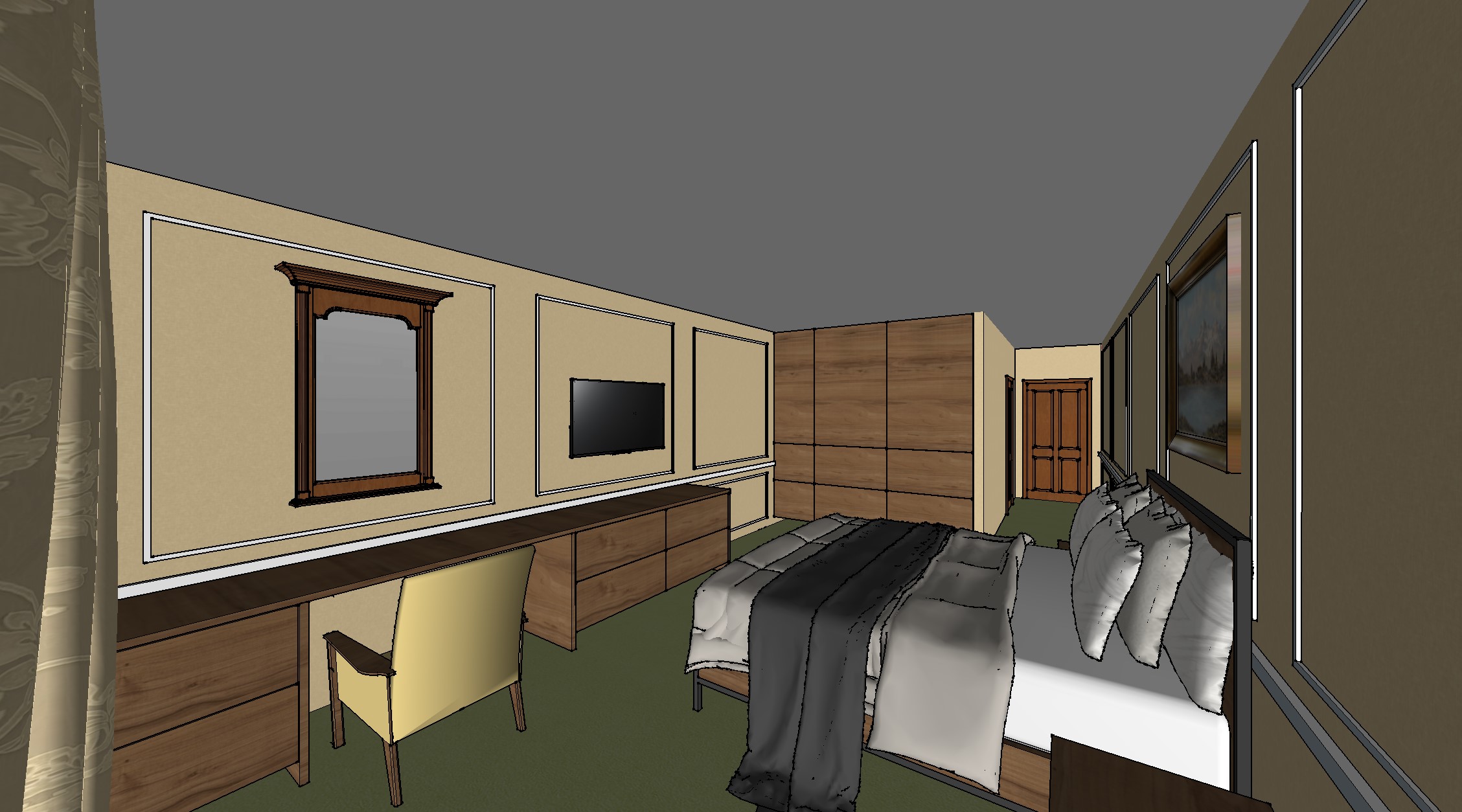 modernist exterior shot render a luxurious bedroom interior with a warm inviting atmosphere use soft beige for the walls and deep brown for the wooden paneling and furniture render the desk and wardrobe in rich walnut and the bed with plush white bedding accented by a dark gray comforter the carpet should be a deep forest green include elegant curtains with subtle floral patterns in muted green the lighting should be soft and ambient creating a cozy and sophisticated ambiance architecture