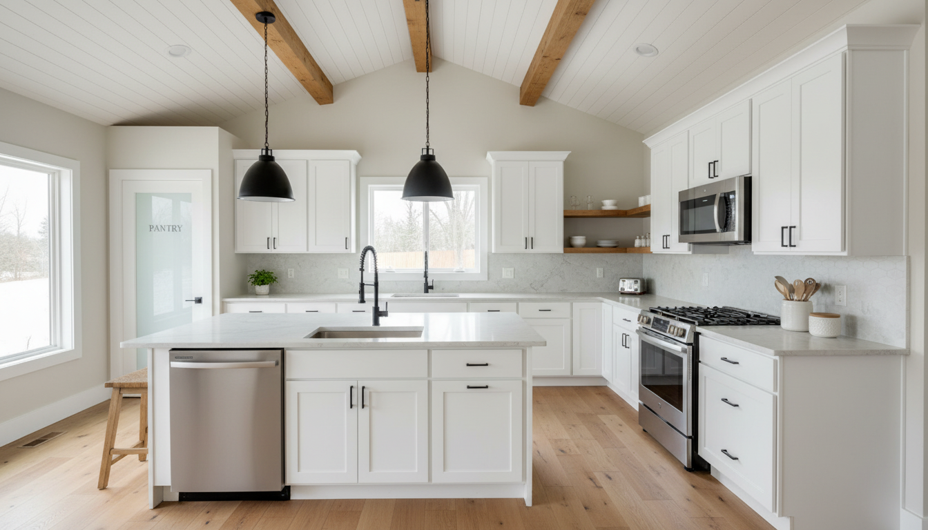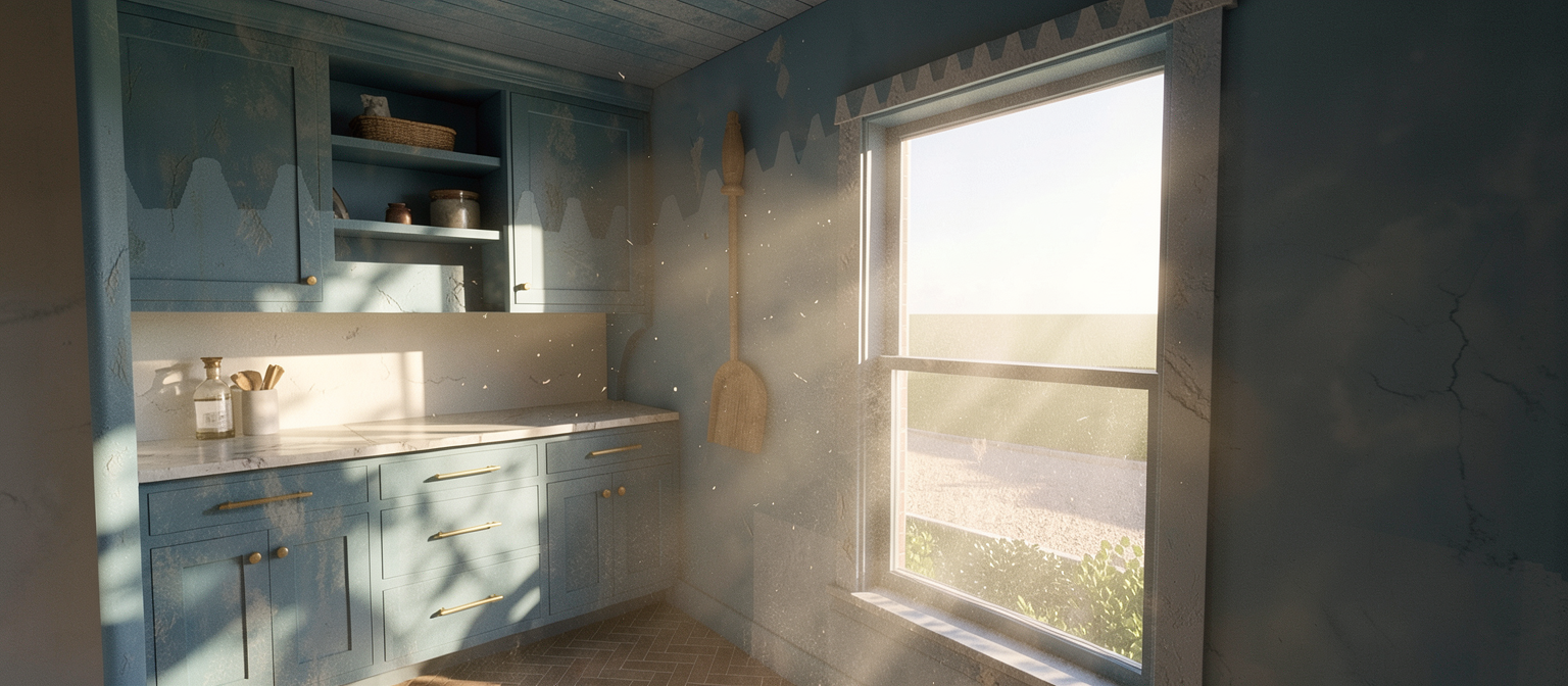 create a realistic rendering with dramatic natural light streaming through the window and remove the jagged dark shadow from the picture and make the walls and cabinetry blue