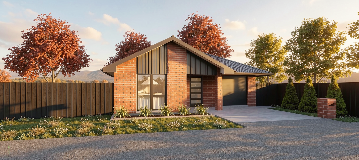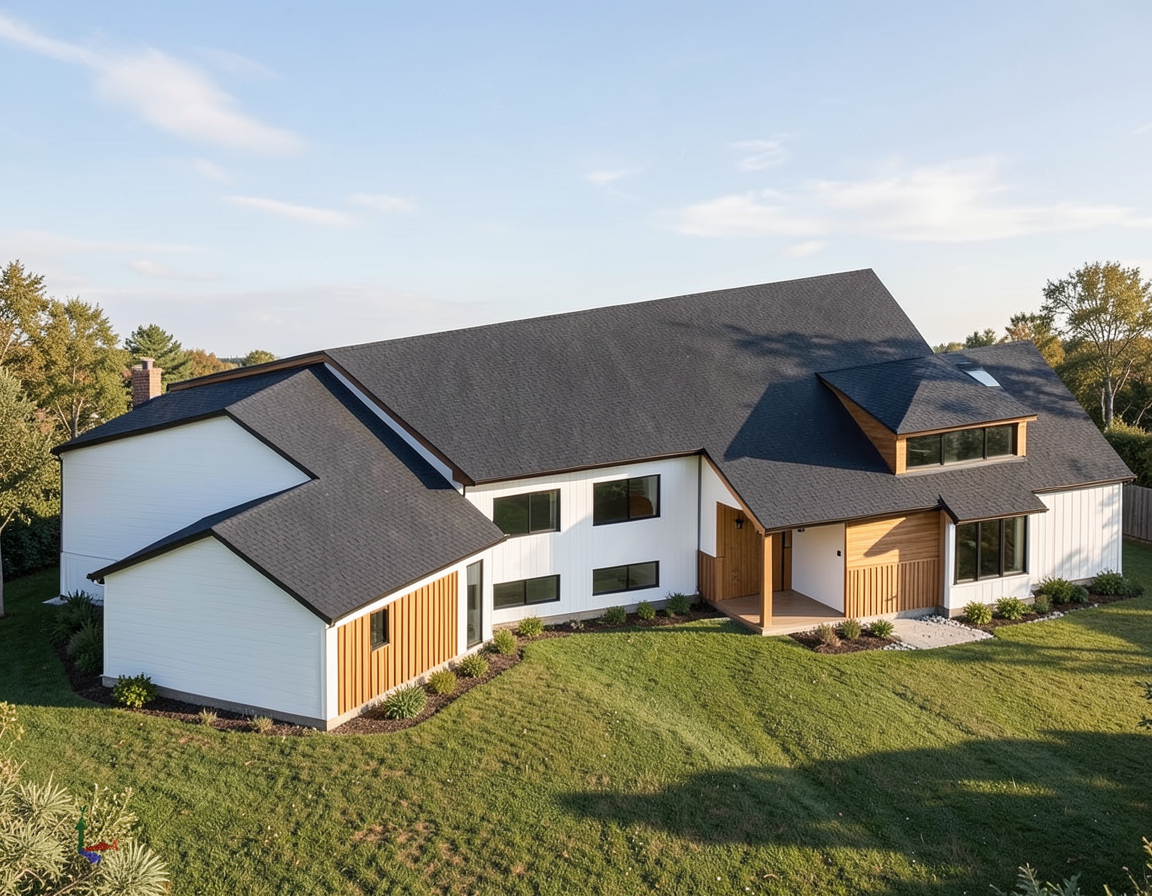 black roof white windows black garage doors off white siding background is a lake siding is white only and no driveway in the front yard