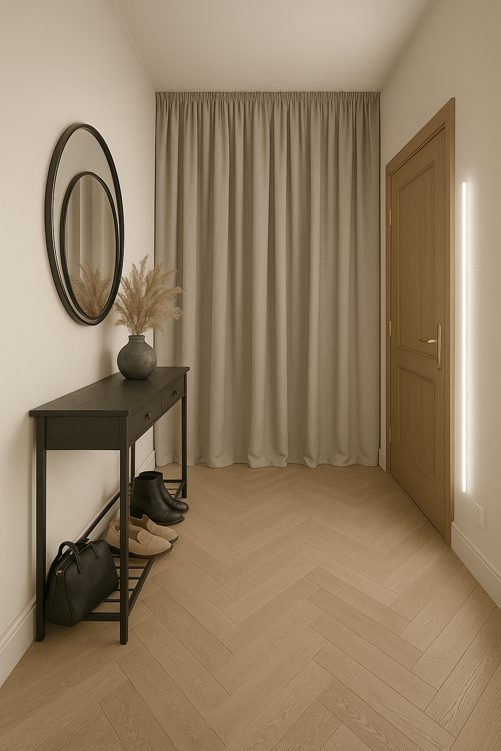 contemporary interior shot entryway to a long hallway with blue and black accents and drapery covering the closet architecture
