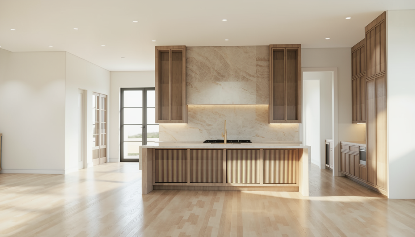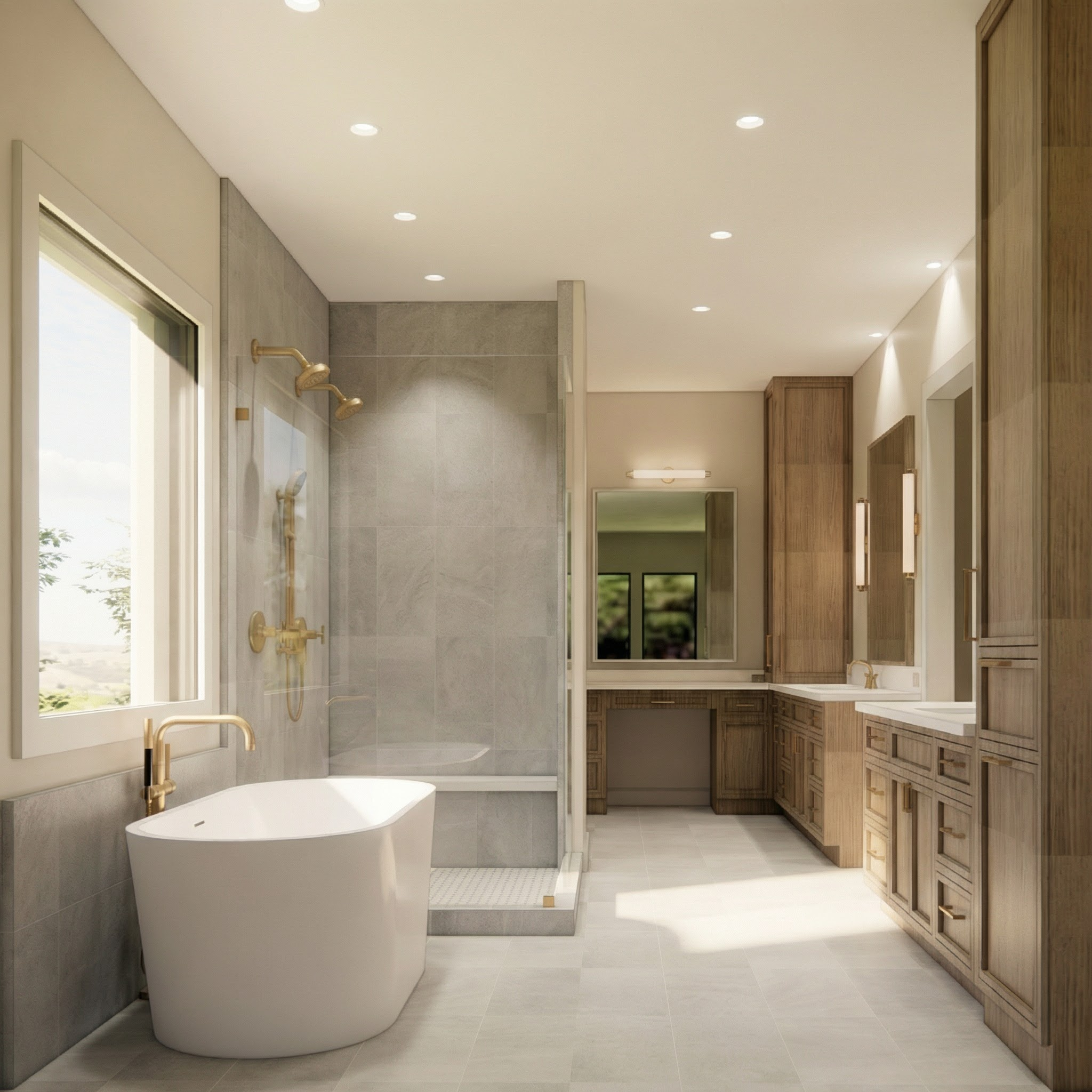 prompt convert this architectural bathroom rendering into a refined editorial quality interior photograph while preserving the exact architecture layout ceiling heights millwork profiles plumbing locations and material selections do not alter the design proportions tile layout or camera angle no additional architectural elements or lighting sources should be introduced the goal is elevated realism with sophisticated natural light not a reinterpretation of the space materials maintain exactly as designed flooring shower walls tilebar ice gray marble honed finish 12x24 format or as shown in rendering soft cool gray tone with natural marble movement and subtle organic veining matte surface reflection consistent with honed stone no gloss or polish walls ceiling if painted sherwin williams origami white sw 7636 soft warm white with accurate undertone and smooth level 4 drywall finish counters if shown taj mahal quartzite creamy beige base with subtle linear veining and natural depth honed or polished only as depicted in the rendering lighting direction editorial quality soft natural daylight filtering through windows light should feel diffused and calm spa like atmosphere gentle shadow gradients across marble surfaces to emphasize texture accurate light falloff along floor planes and vertical tile surfaces no under cabinet lighting no artificial glow or exaggerated hdr effect maintain realistic reflection levels on honed marble subtle not shiny editorial photography style high end luxury residential editorial photography full frame camera 28 35mm lens straight vertical lines no distortion slightly softened depth of field balanced exposure with gentle highlight roll off on marble clean serene spa quality mood realism enhancements add micro texture and soft surface variation to honed marble subtle tonal shifts in veining for authenticity realistic grout joints consistent with honed marble installation soft ambient occlusion in corners and shower niches eliminate cgi flatness while preserving exact design intent