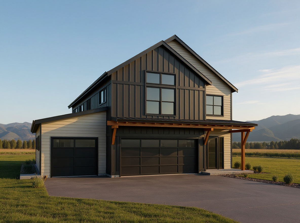 modern house exterior with a minimalist design white lap siding dark brownish black board and batten siding on the main structure charcoal gray asphalt shingle roof large windows with clear glass garage doors in sleek black smooth asphalt driveway serene afternoon light with a clear blue sky casting soft shadow landscaping including large shrubs and neatly trimmed grass for a polished finish low mountains in the background