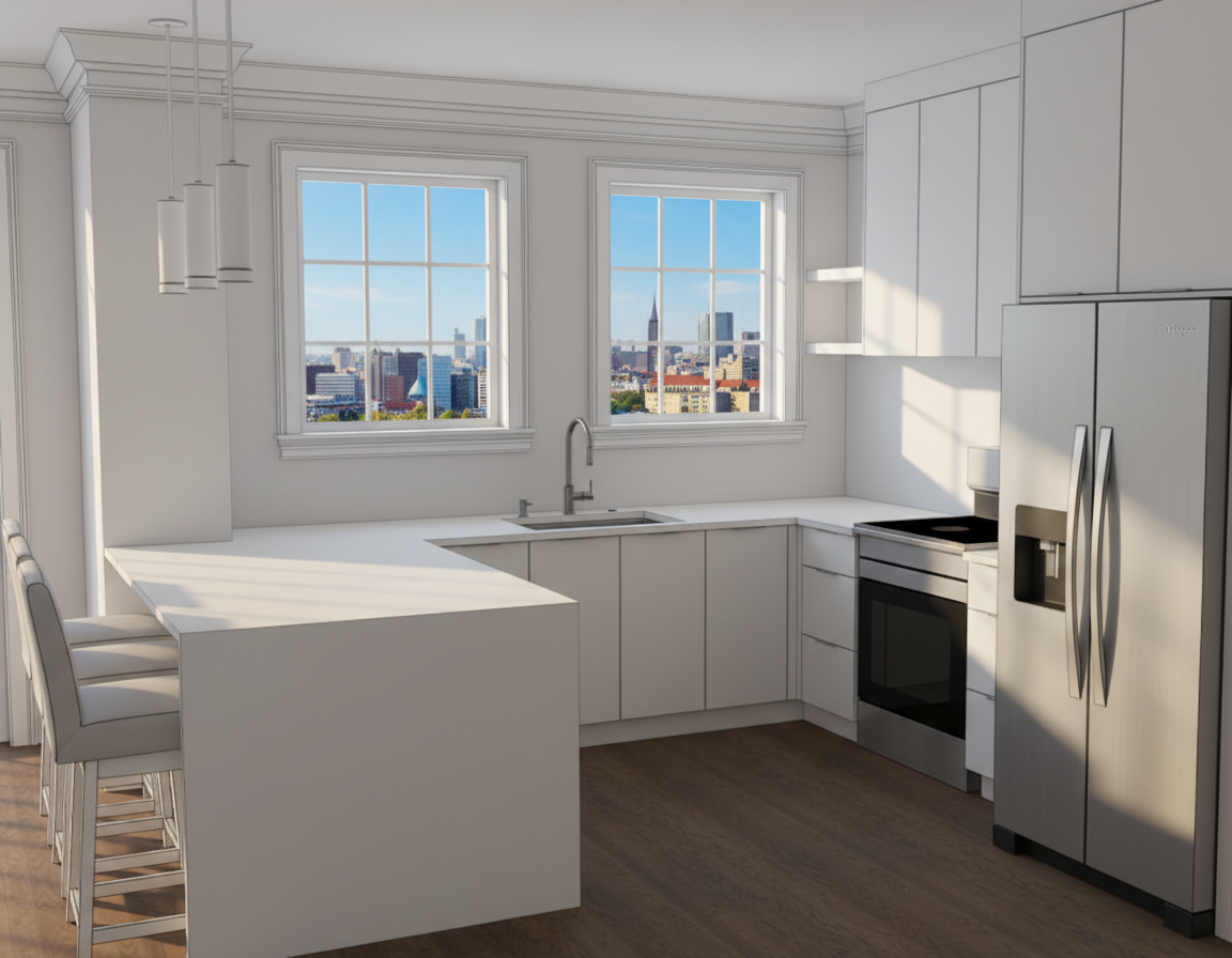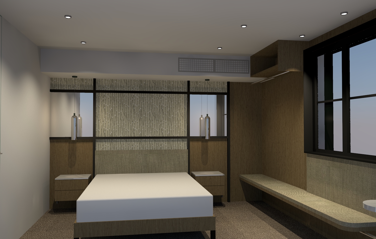 keep all textures and materials the same and same size place luxurious bed linen and pillows on bed place padded bench seat cushions on bench seat in same texture only under window