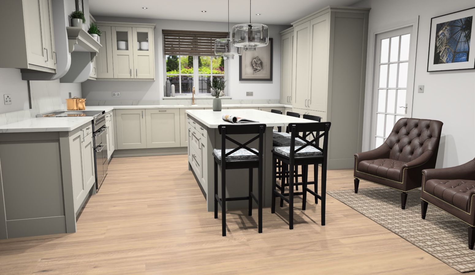 make this image 8k hyper realistic as if it were taken via an iphone camera artificial lighting should beautifully blend with natural lighting showing the subtle grain effect on the painted ash kitchen door keep dimensions the same and in a landscape format keep dimensions the same midday sunlight coming through large windows casting realistic shadows and reflections shot with a dslr camera 35mm lens shallow depth of field ultra high resolution photorealistic ray tracing global illumination highly detailed textures realistic lighting cinematic composition