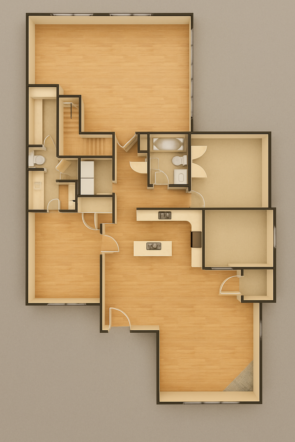 ultra realistic photorealistic interior rendering of a custom designed kitchen shot at eye level with a professional architectural photography look maintain all cabinet colors exactly as shown in the original design no color changes perimeter cabinetry features flat panel inset doors painted in a very light soft cream taupe tone with a smooth matte finish the kitchen island cabinetry is stained a medium tone brown maple wood smooth texture and very little grain texture rich and warm matte surface all countertops are natural soapstone deep charcoal with very subtle veining and a soft honed finish backsplash is a natural off white stacked subway hood is the same color as the cabinets keep the horizontal lines that create a paneled look and keep the wood detail at the bottom color of the wood detail should be the same as the island cabinetry color add soft warm ambient lighting throughout the space including discreet under cabinet lighting that gently washes the soapstone countertops and highlights textures without glare lighting should feel inviting natural and realistic as if photographed during late afternoon or early evening materials should show true to life texture accurate reflections soft shadows and realistic depth of field no exaggerated contrast no stylization no color shifts true architectural realism editorial quality interior photography 8k detail global illumination physically accurate materials