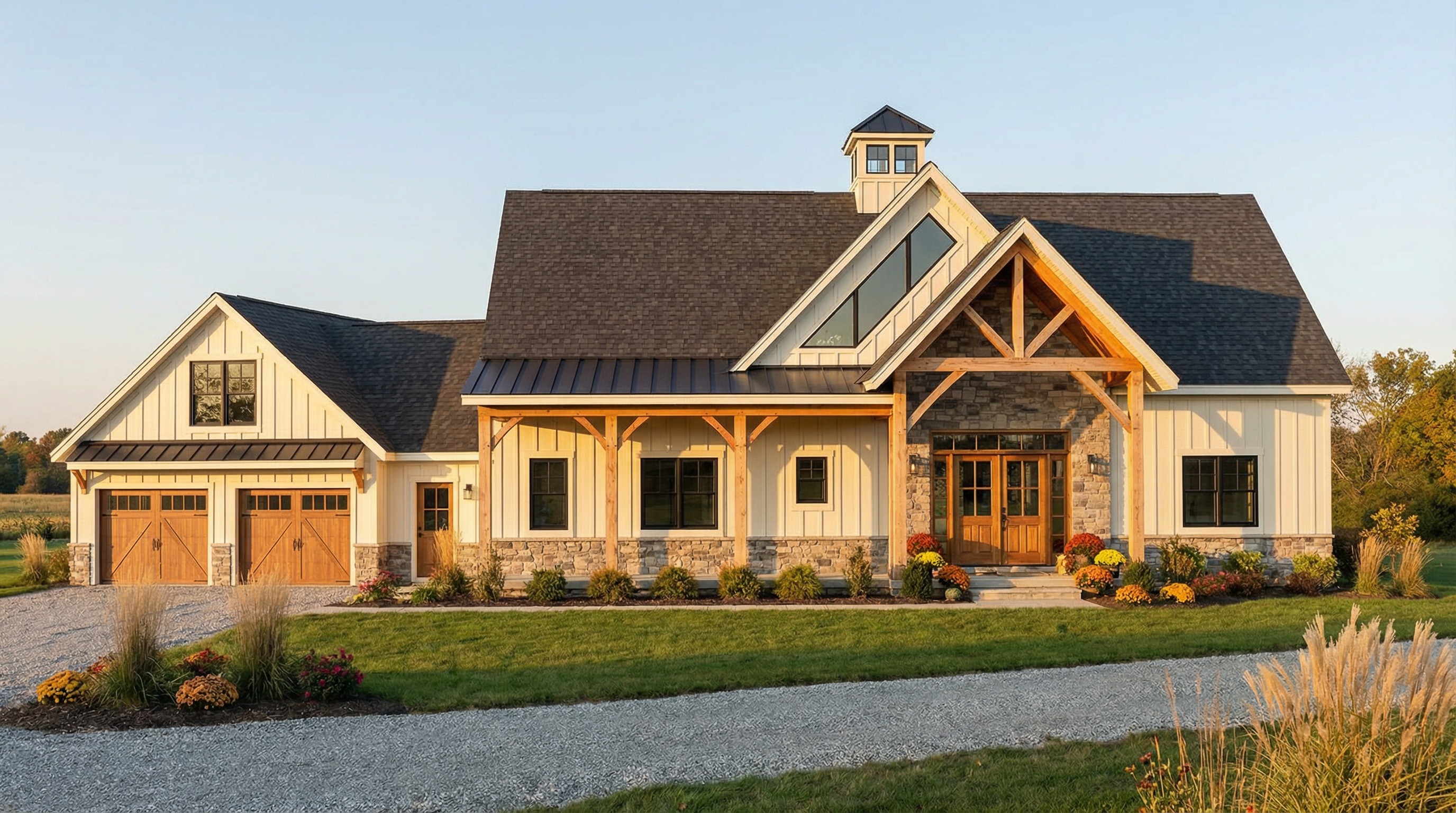 2 story country home no garage doors on front make the center dormer bigger real cedar shake accents awning roof over garage windows and as appropriate add more detail character to the front do not make it look overpoweringly tall modern farmhouse barn dominium style with a touch of coastal cottage make it realistic both in concept and builder sense put garage section on left no