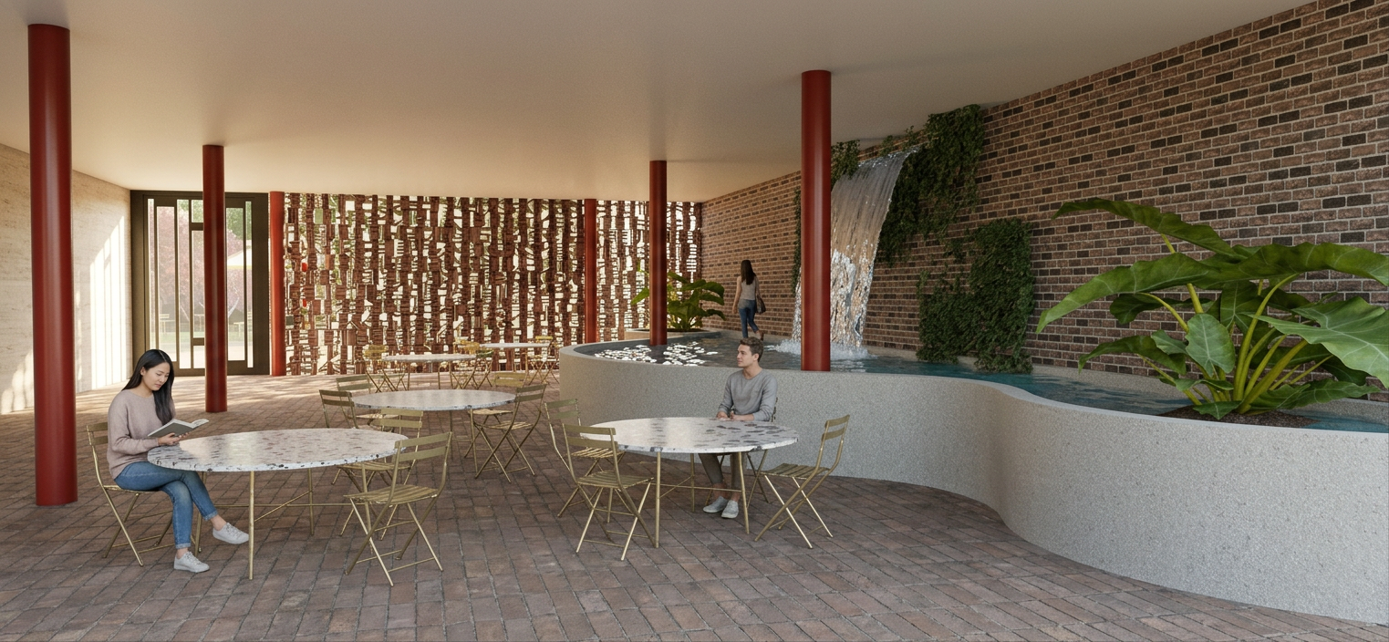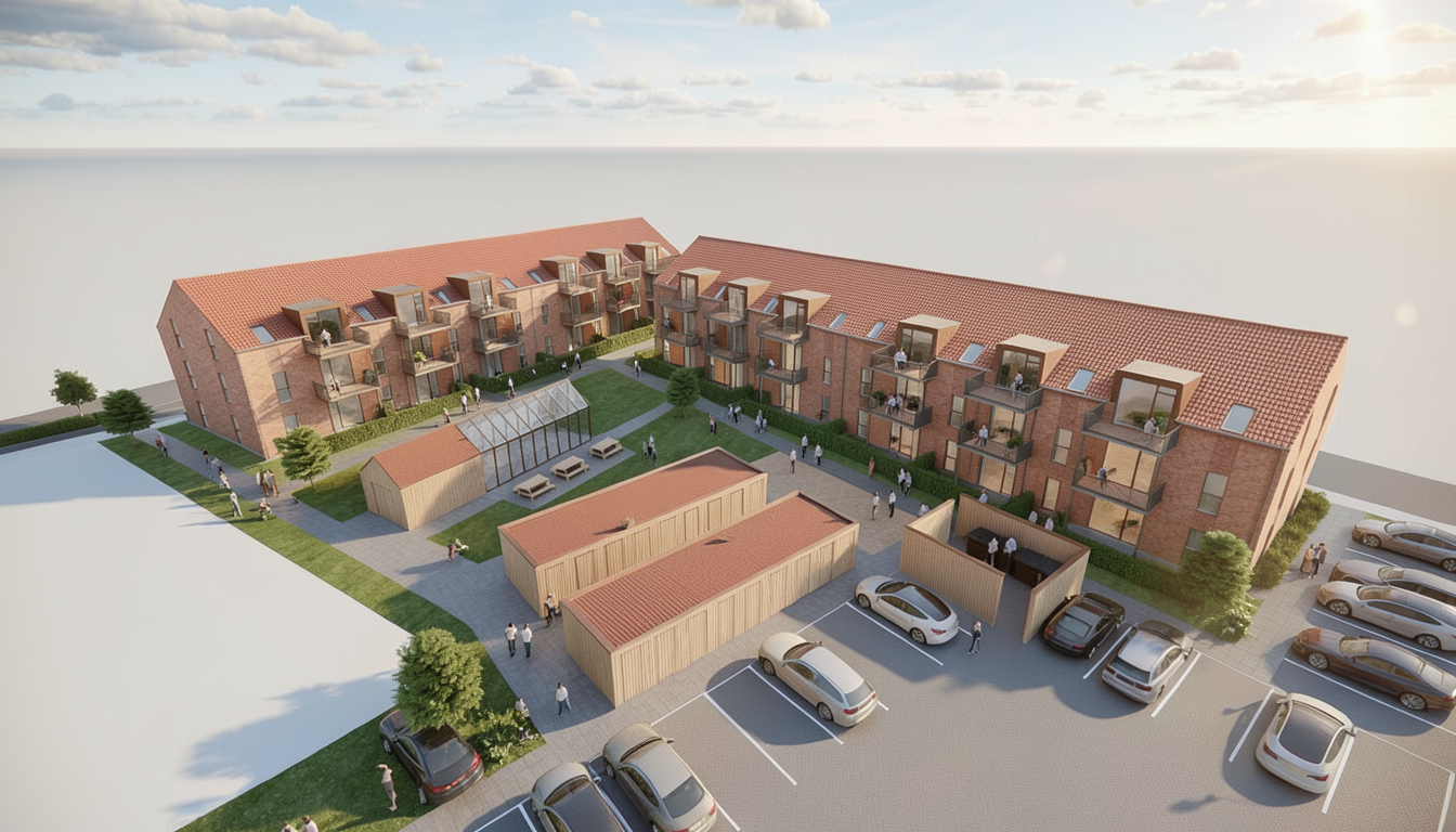 use the provided enscape render as base reference keep exact layout proportions and camera angle add a few people on paths and balconies