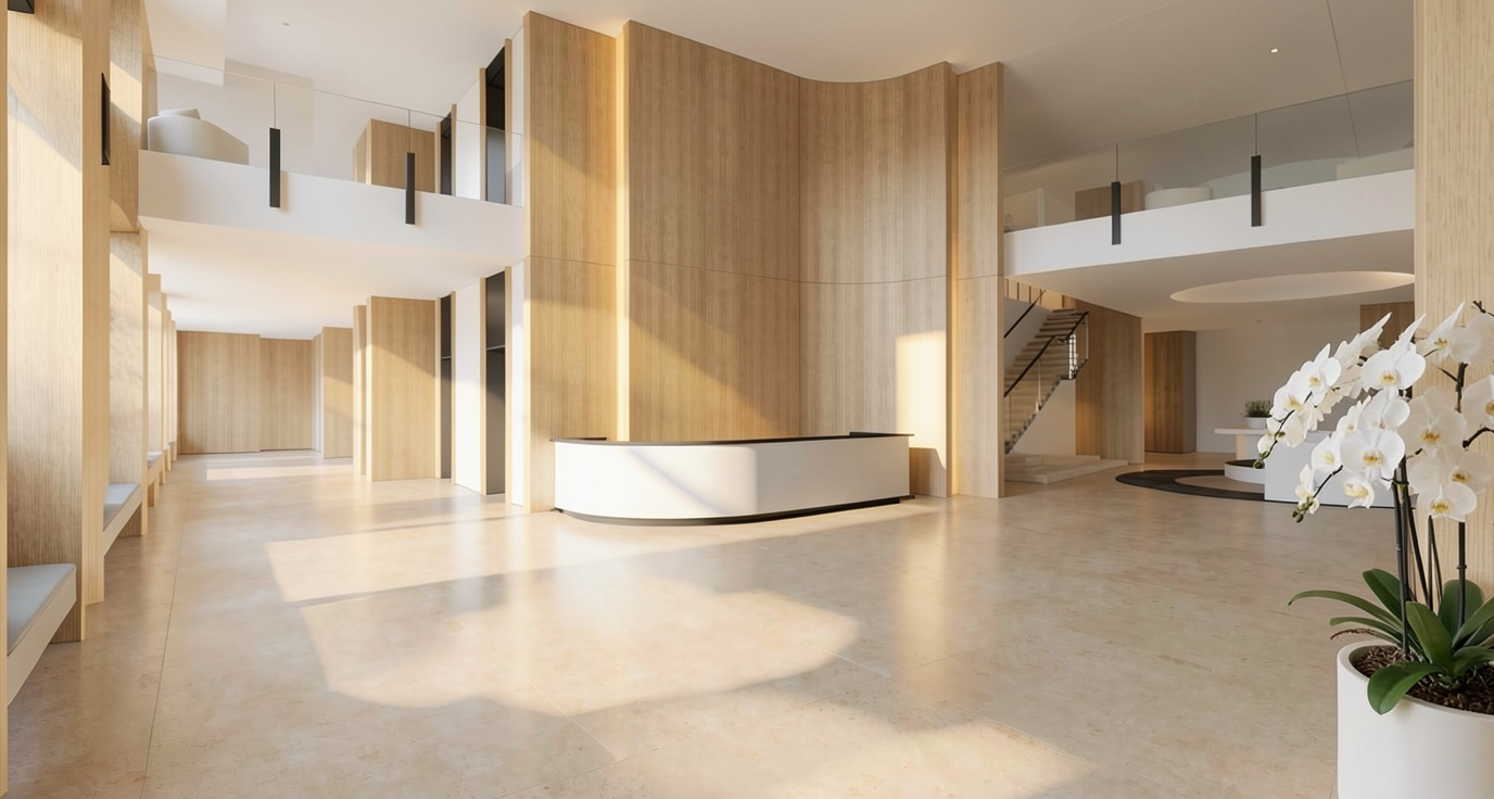 realistic image dusk light outside windows 2 glass globe pendants at island add painted white panels at columns arch and beams above add painted white wainscot at lower walls add decorative place settings remove ceiling beams add back dining table in background remove 2nd sink in background remove window in background remove ceiling beams