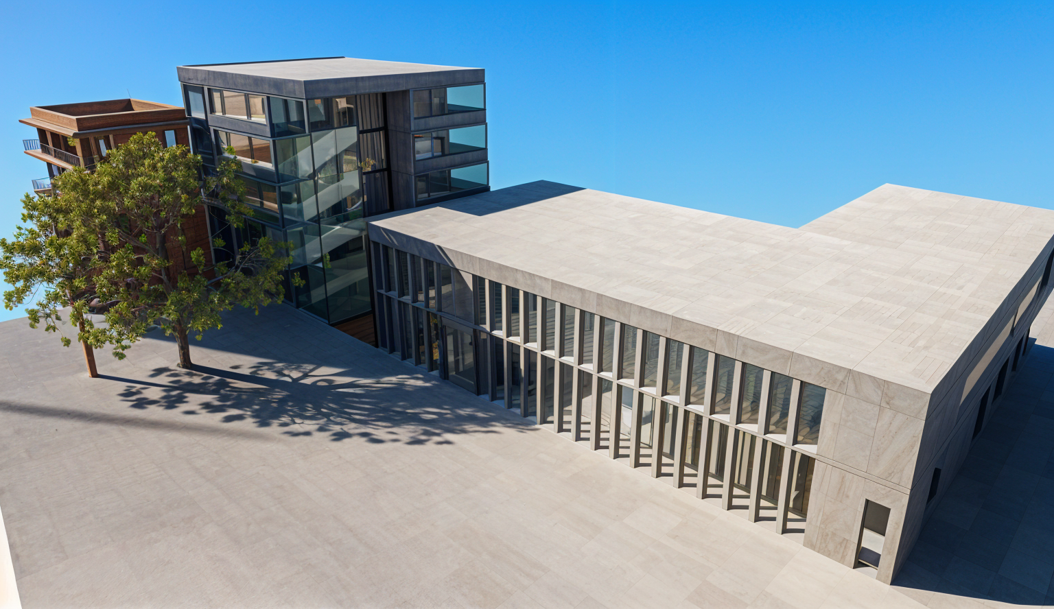 modern architectural scene featuring a sleek contemporary building made of gray exposed concrete and large glass windows positioned next to a vintage red brick building that remains unchanged in front of the buildings lies an asphalted plaza designed as an aesthetic human centered space where a few parked cars are visible the plaza integrates subtle greenery with small planted areas and trees that soften the urban character a spiral staircase with elegant glass railings wraps around vines with lush green leaves blending nature with architecture behind both the high rise concrete building and the brick structure railway tracks run transversely through an open industrial landscape adding depth and context in the far distance the silhouette of an airport is visible on the horizon the entire scene is illuminated by the warm cinematic light of dusk creating a calm atmospheric evening mood with gentle reflections on the glass and concrete surfaces the style should be realistic and consistent with the reference image