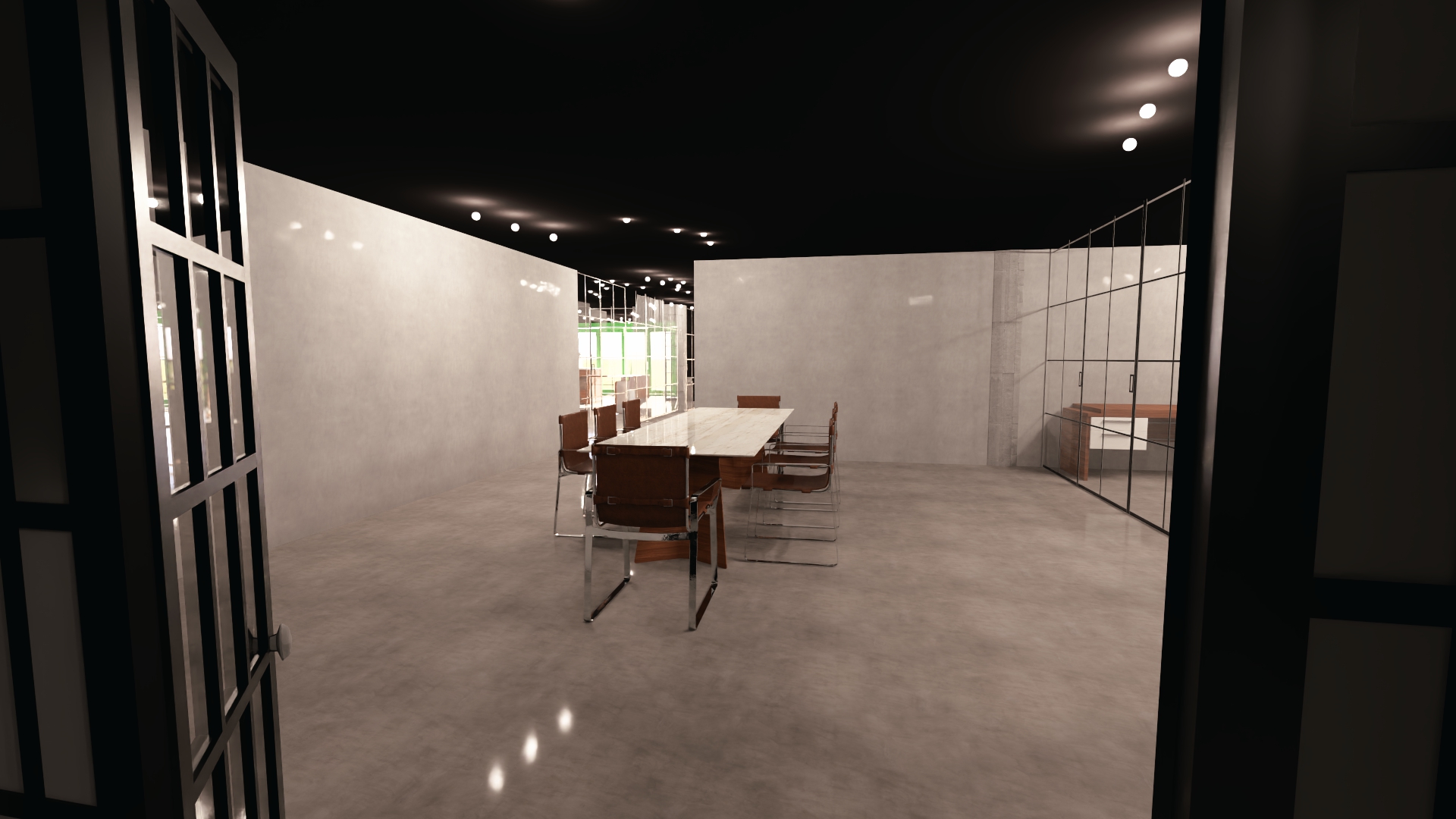 film production office golden framed mirrors on left and front wall grey floor concrete walls and columns black framed glass doors light up interior add floor lamps with cloth white shades all technical lights change to erco light much more add chandelier with shade above big table