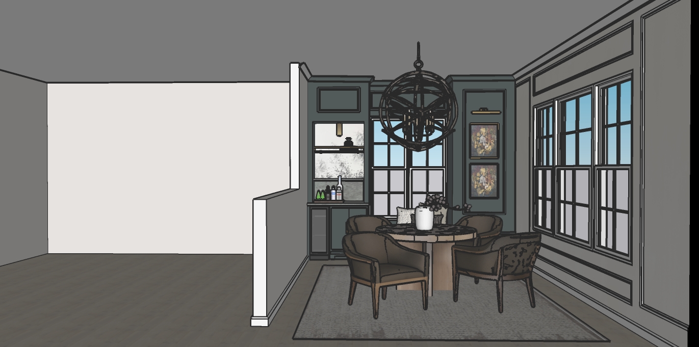floors are oak table is light oak the chairs are olive brown fabric with medium oak legs the back wall is salamander by benjamin moore the other walls are light grey color the rug is a brown grey with a pattern the ceiling is 10 and the cabinet on the left side of the partial wall go up to 8 the wall cabinets are white and the base cabinets are navy with a white quartz countertop there is a stainless hood between the white cabinets the window frames are white