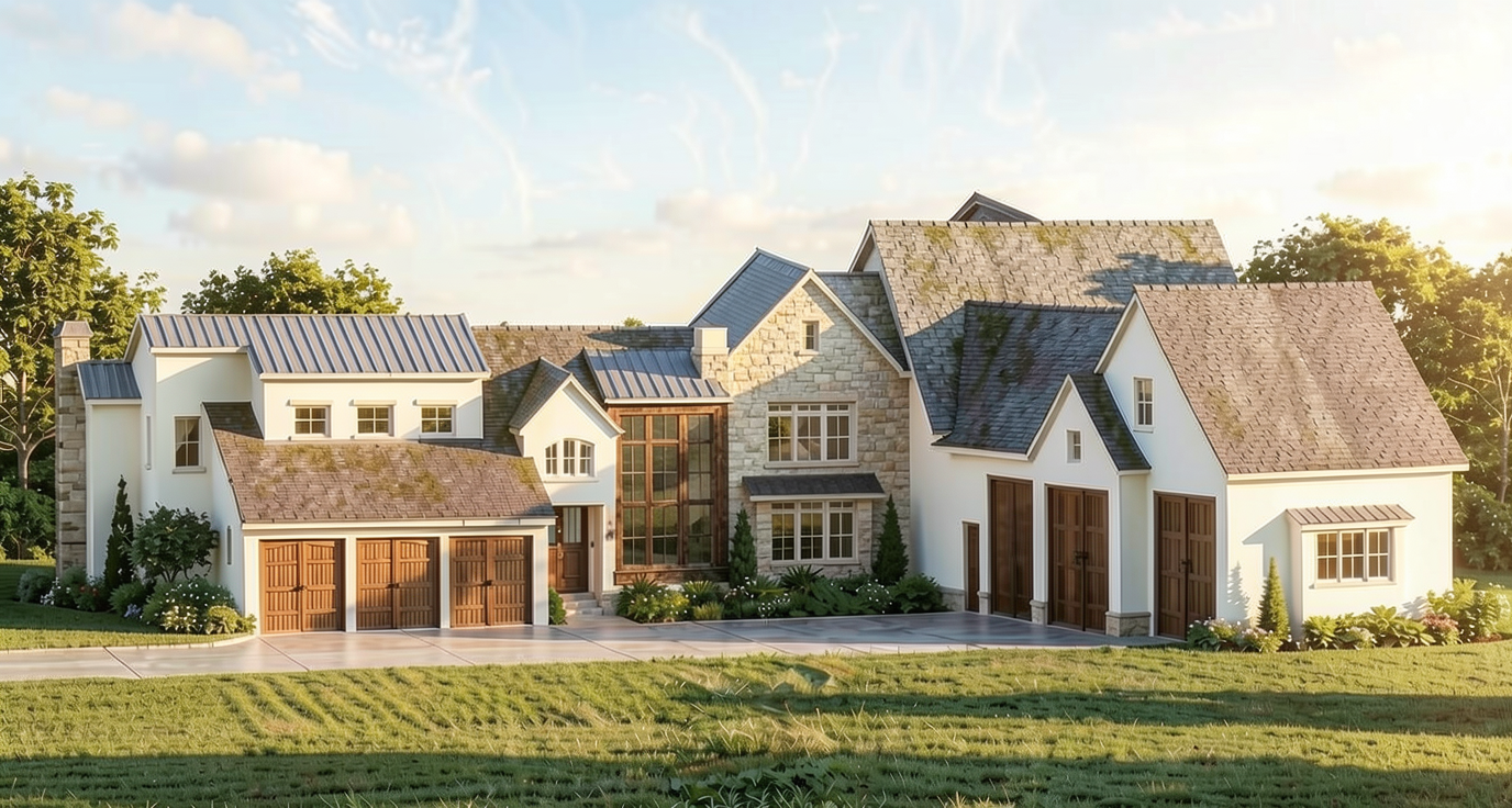 keep the existing stone wall exactly as it is do not modify recolor or replace the stone material on any wall surfaces lock all wall materials in place except for the chimneys change the material of the chimney stack to a light colored brick with a smaller brick pattern apply this only to the chimney structure that extends above the roofline do not apply brick to the wall below or behind the chimney treat the chimney as a separate vertical object the stone wall and chimney are separate materials do not merge or blend materials between them do not modify any adjacent stone or siding surfaces