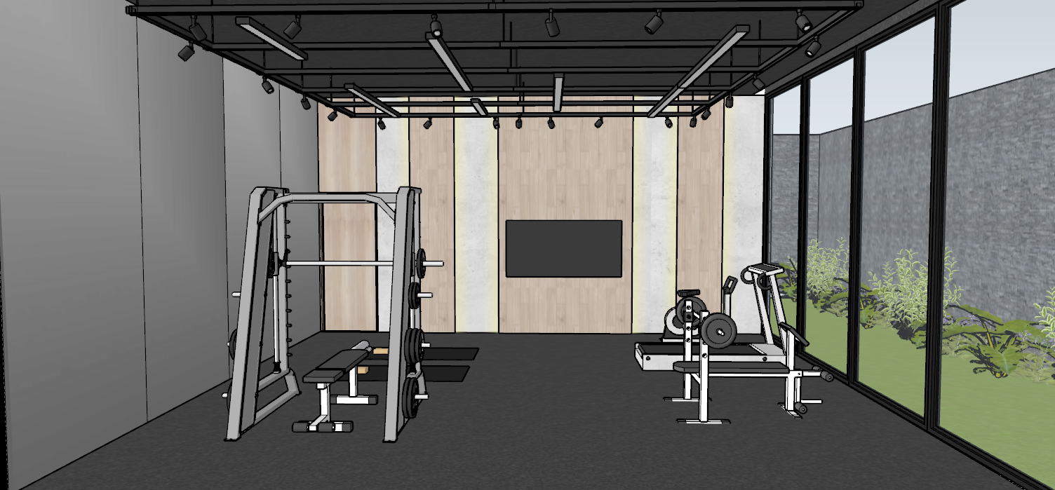 render a modern gym interior with sleek design elements the gym equipment showcases metallic silver and black accents for a polished look the walls are a soft neutral gray with sections of light wood paneling for warmth the left wall is all mirror the ceiling consisting of black beams and track lights adds an industrial touch floor to ceiling glass windows on one side offer a view of lush greenery outside with rich green foliage and a gray stone wall as a backdrop the flooring is a dark charcoal gray providing a sophisticated professional atmosphere the overall ambiance is minimalistic bright and inviting emphasizing a balance between functionality and style