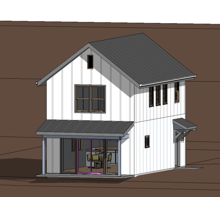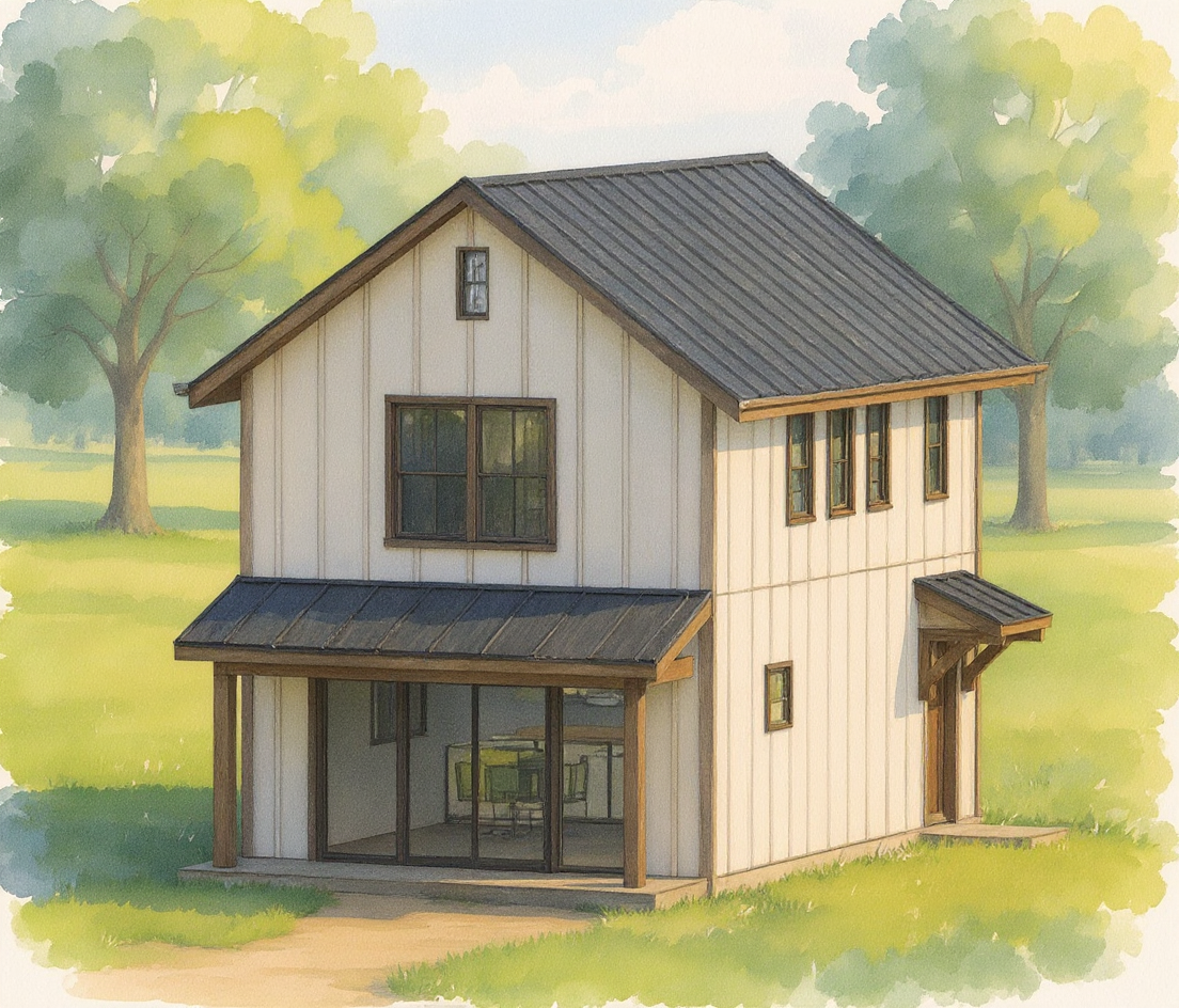 black and white hand drawn architectural pencil style rendering showcasing black standing seam roof board batten siding clear glass wood columns and side entry brackets set in a soft virginia meadow