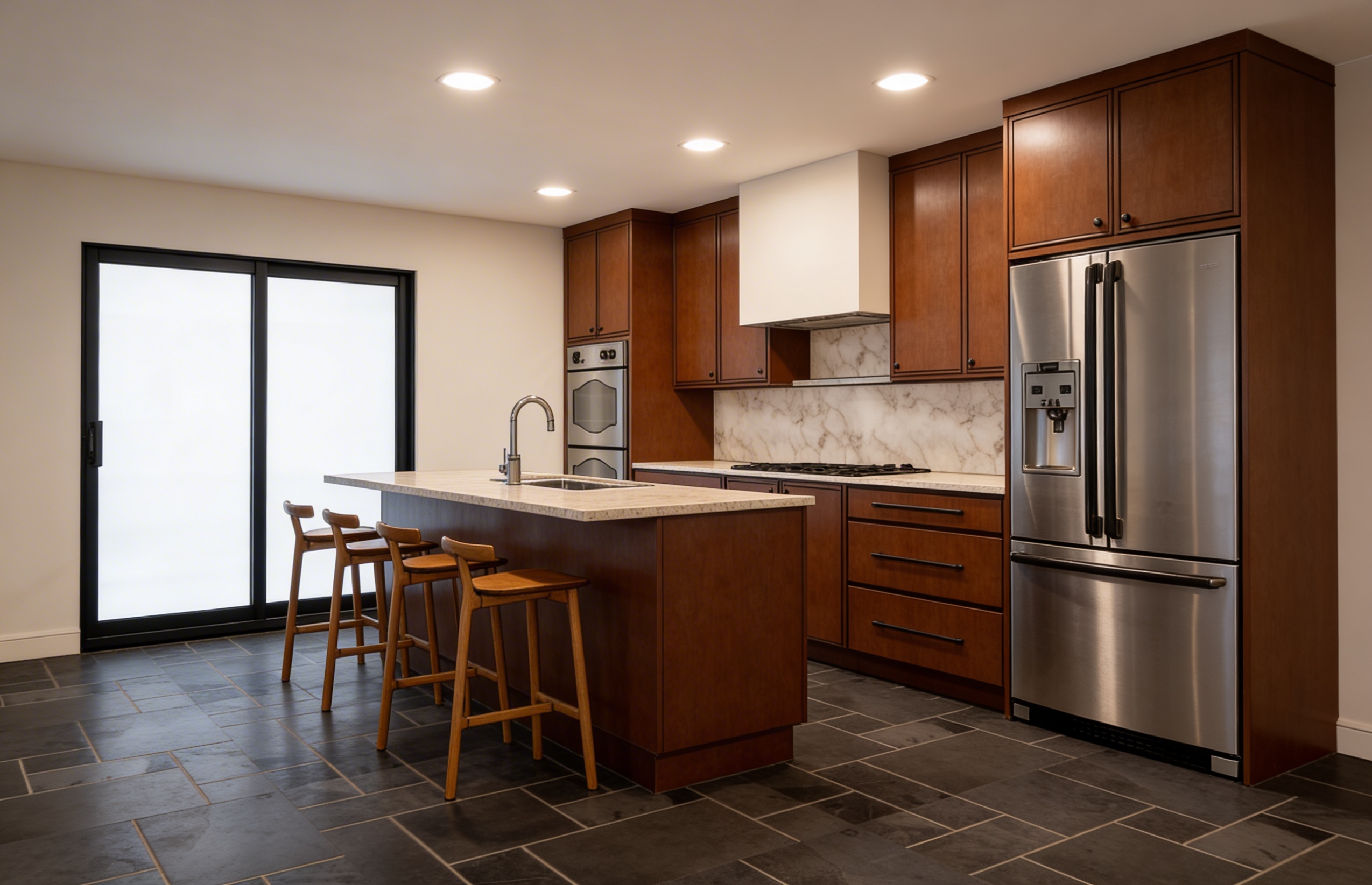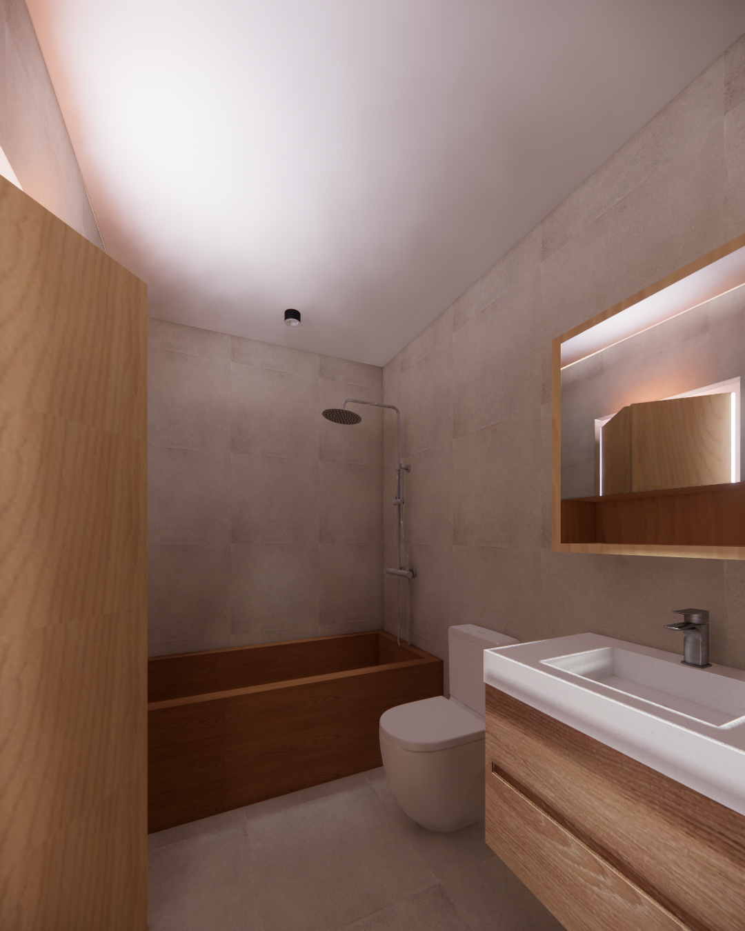 create a render in hyper realistic architectural visualization quality 8k resolution all objects furniture sanitary ware and architectural features must remain in place do not add any objects or delete anything from the image the spatial configuration must remain unchanged warmth gentle reflections soft shadows enhanced color richness and luxurious level realism improve depth and realism through wood grain richness brass highlights fabric texture and polished clarity while keeping the entire scene exactly as originally designed use downward facing light from the spherical wall lamp next to the round wall mirror use general daylight lighting in the room use a smooth white wall surface above the tiles the wall covering should be the same light color as the floor covering