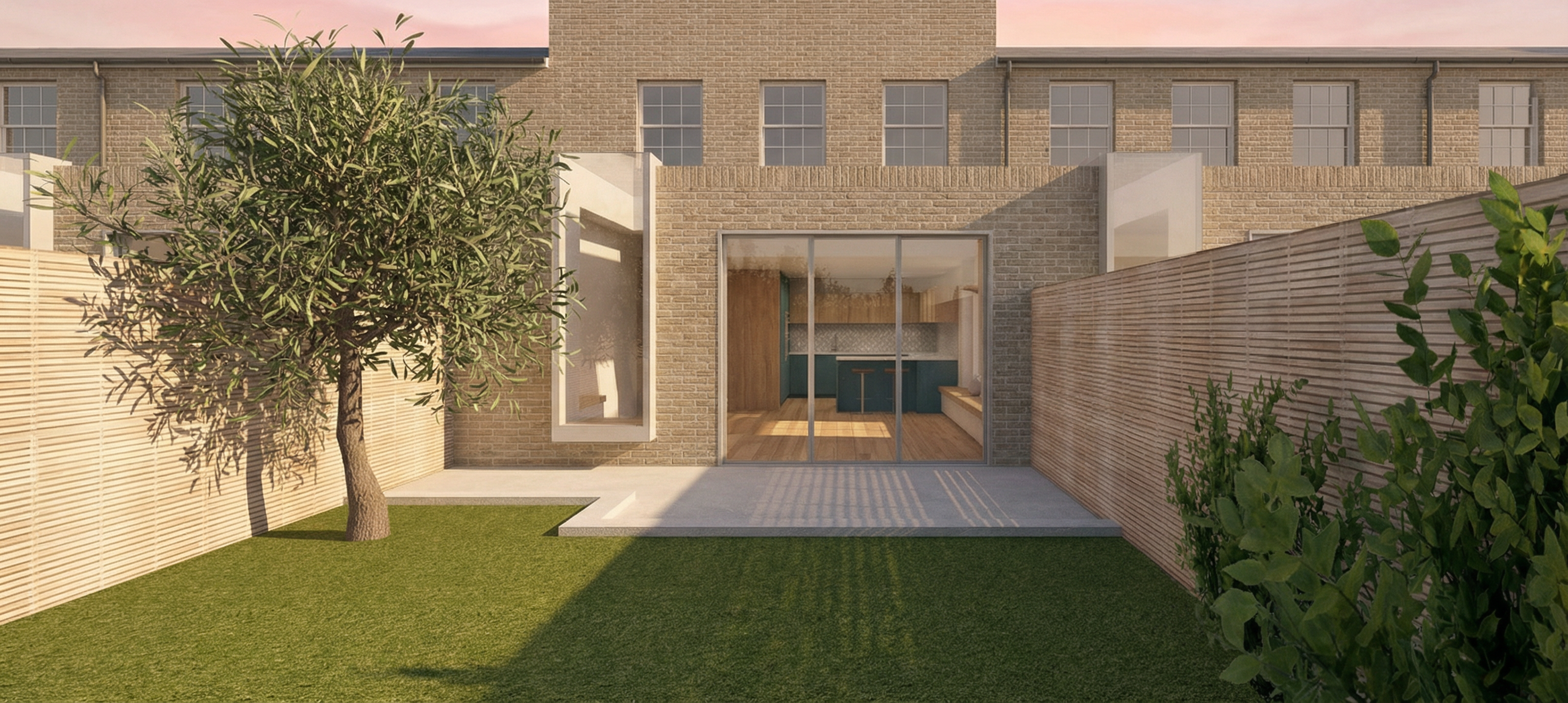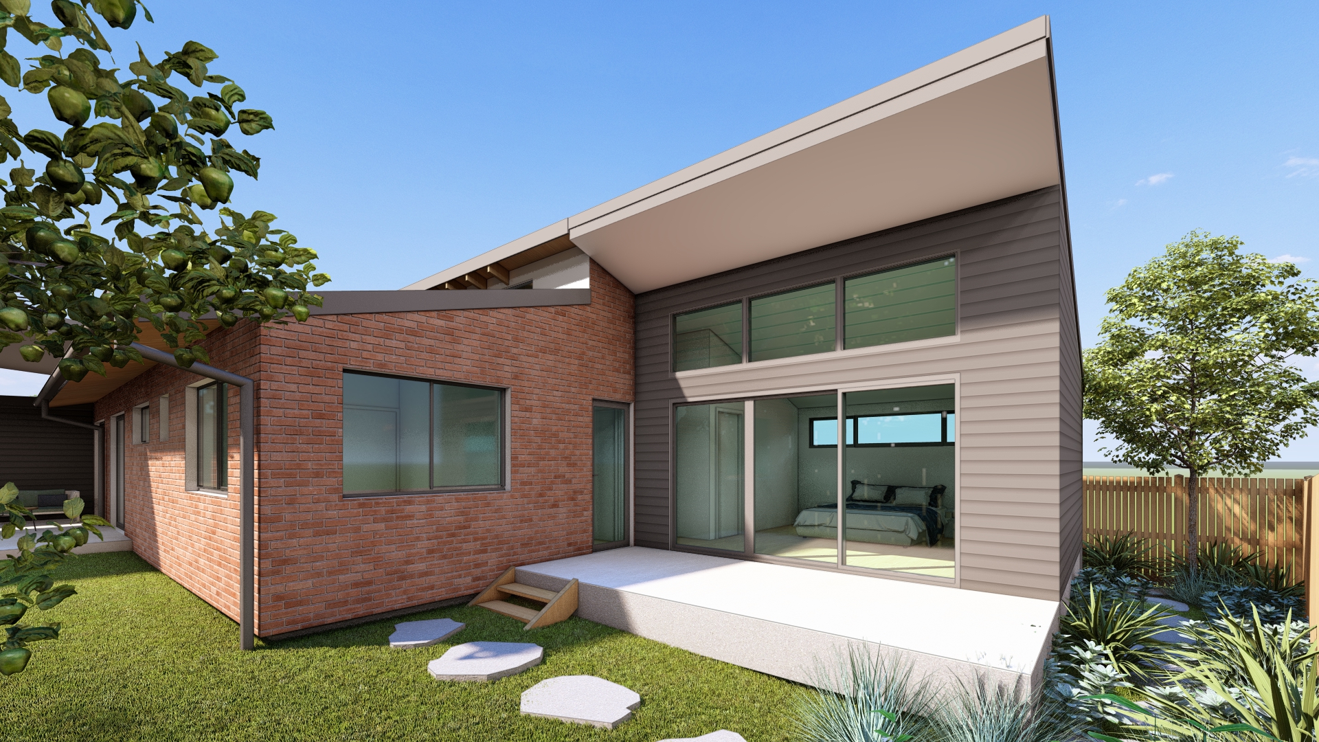 render a modern minimalist house with an inviting backyard atmosphere the building features red brick walls complemented by sleek dark gray horizontal siding wide glass windows reflect a clear blue sky enhancing the open and airy feel lush green grass and vibrant greenery including fruit trees and shrubs surround the area creating a serene garden setting the pathway is composed of neatly arranged light gray stepping stones leading to a cozy patio with light brown wooden steps the overall mood is tranquil and warm with soft natural lighting casting gentle shadows