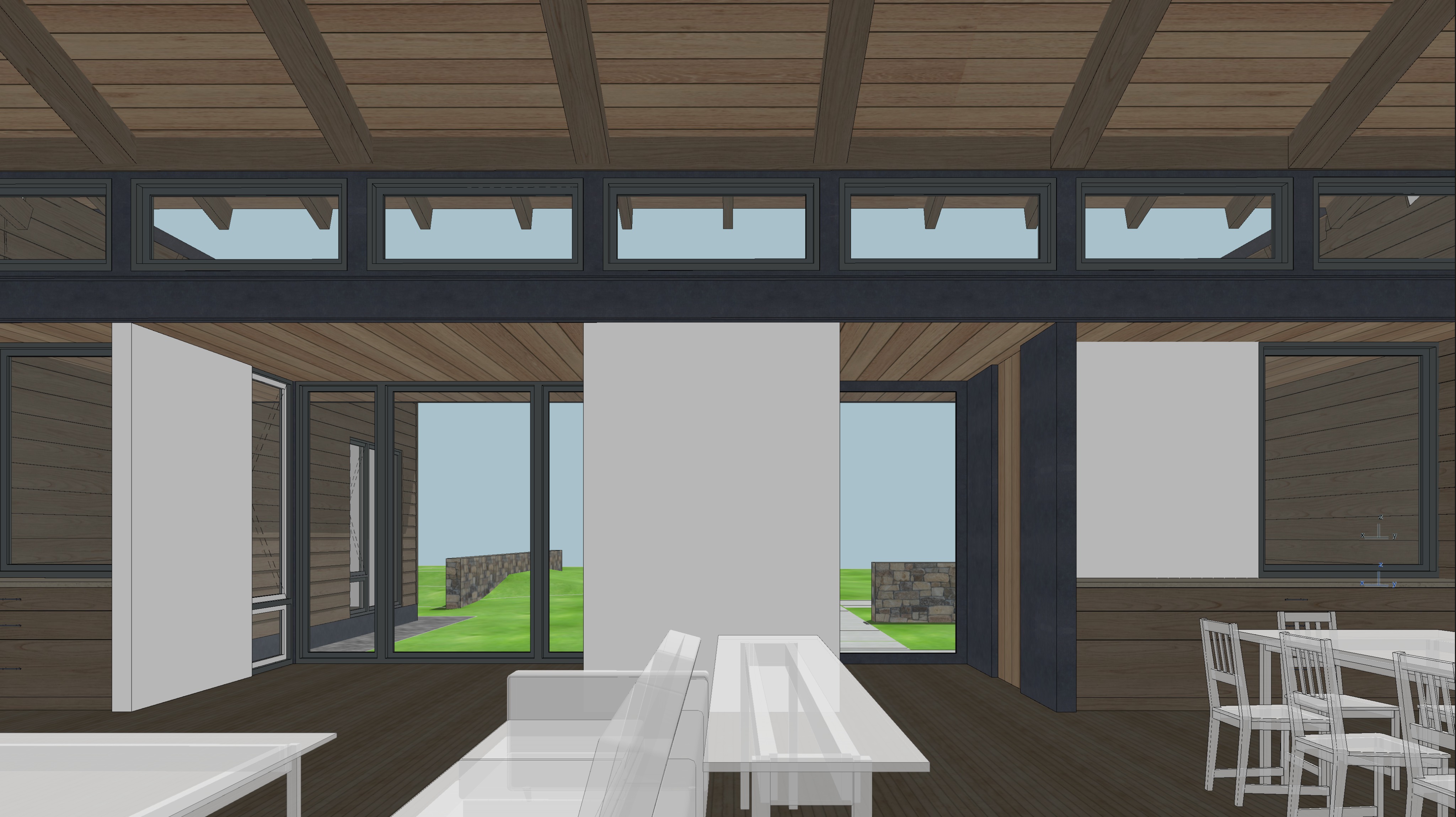 white oak table and chairs fabric couch wild mountain grasses outside mountains close in the background
