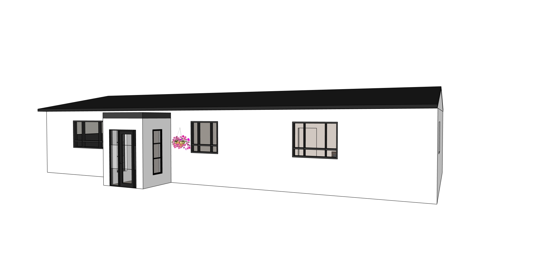 exterior shot render a modern minimalist house with a sleek black roof and white walls the windows and door frames are a deep charcoal gray add a decorative hanging basket with vibrant pink and purple flowers set the scene in a serene daytime atmosphere with soft natural lighting casting gentle shadows to create depth and warmth nice garden exterior trees and paving sunny day