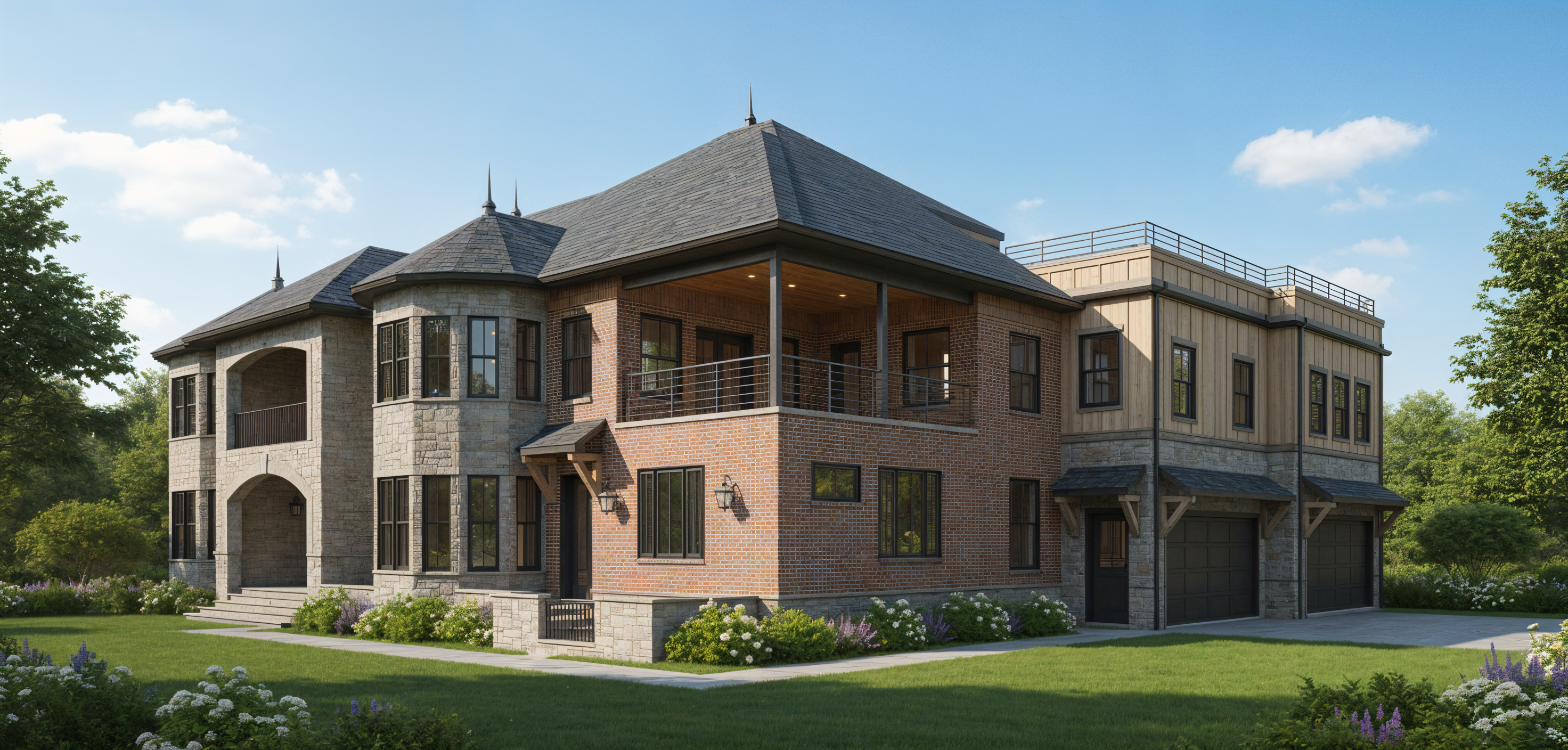 the brick and stone will be white wash finish the roof shingles and windows will be black the lap siding and borad batten will be white all railings will be black