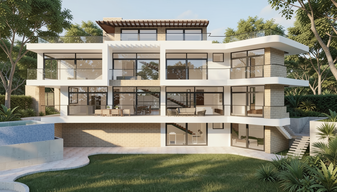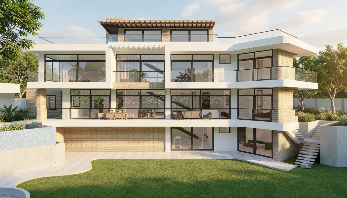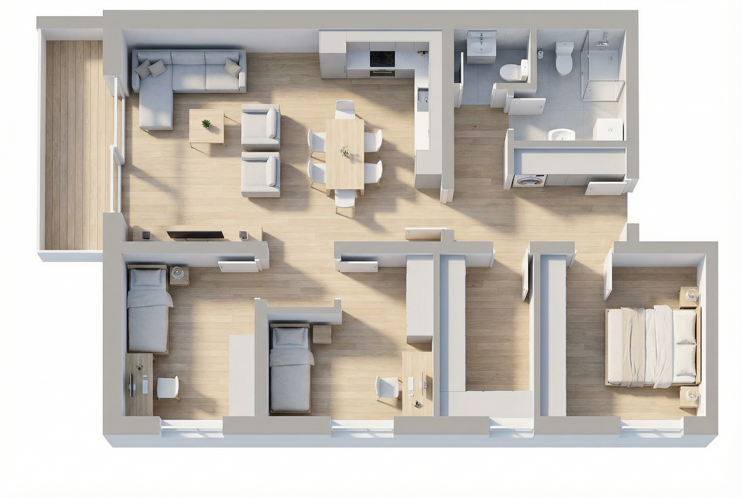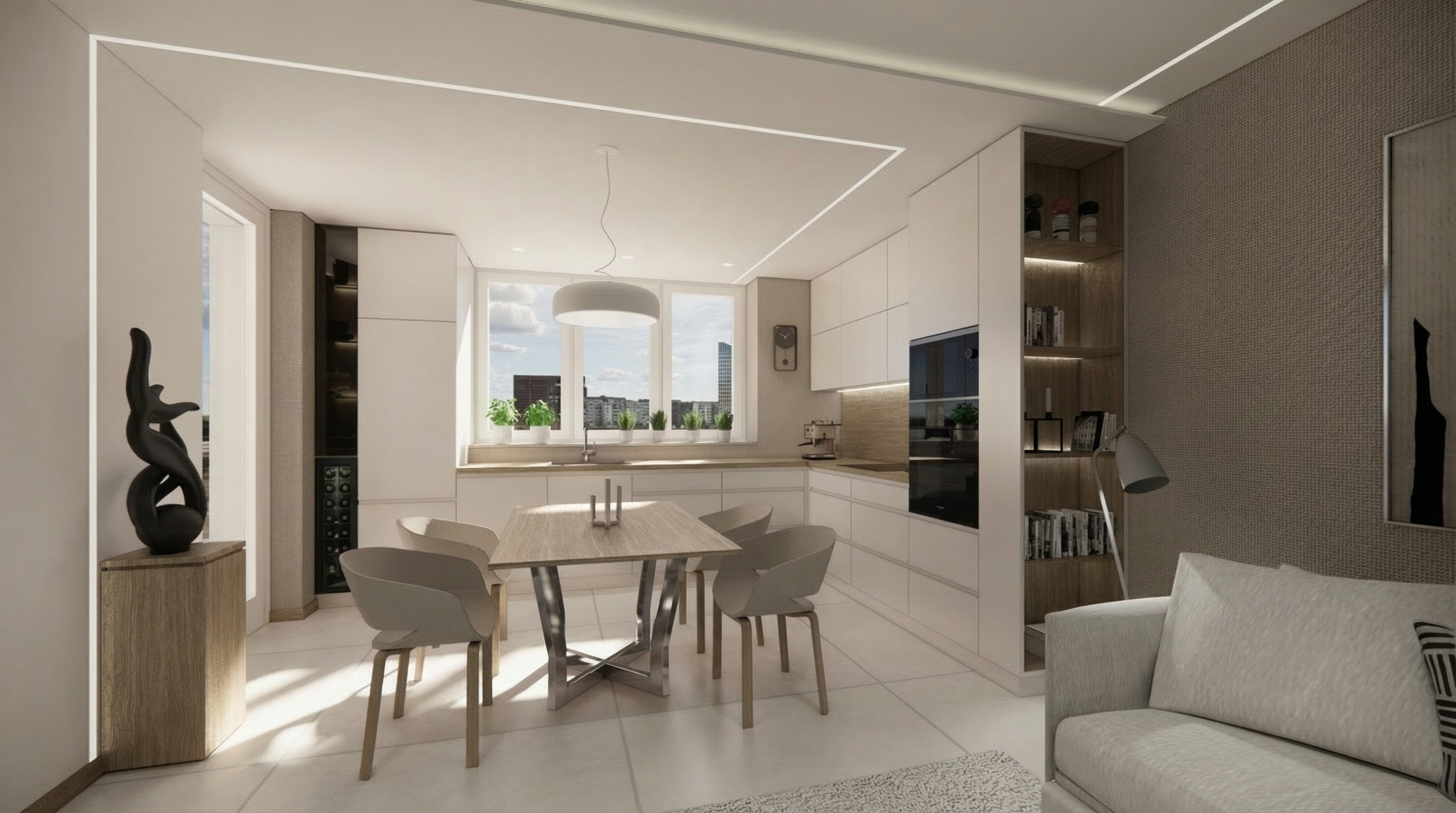 modern minimalist kitchen interior with clean white silk grain kitchen cabinets and light oak decorative elements the dining table is made of light wood with modern metal legs the exact type of dining chairs is iddesign edina design chairitem number 56081t padded beige chairs normal natural light streams in through the large windows illuminating the white slightly marbled floor which is slightly shiny the atmosphere is calm and serene with a touch of sophistication the walls are decorated with soft neutral shades of textile effect wallpaper a contemporary black sculpture adorns a small wooden stand herbs basil parsley in white pots line the windowsill lending a touch of freshness to the space the sofa has a tectil cover slightly wrinkled with naturally placed cushions the wooden furniture and covering elements are light oak in color the quality of the render should be maximum with a realistic effect which is especially noticeable on the textures