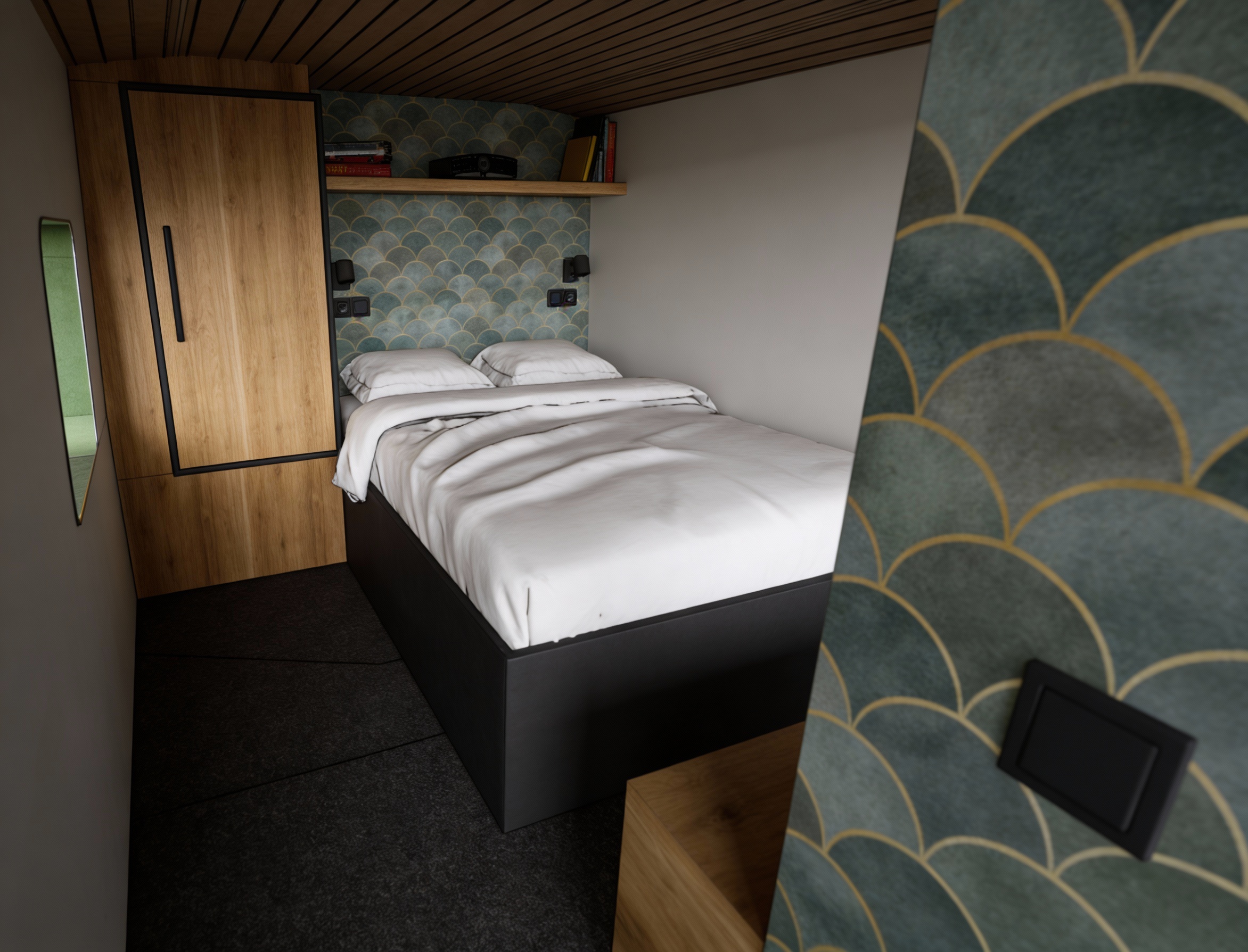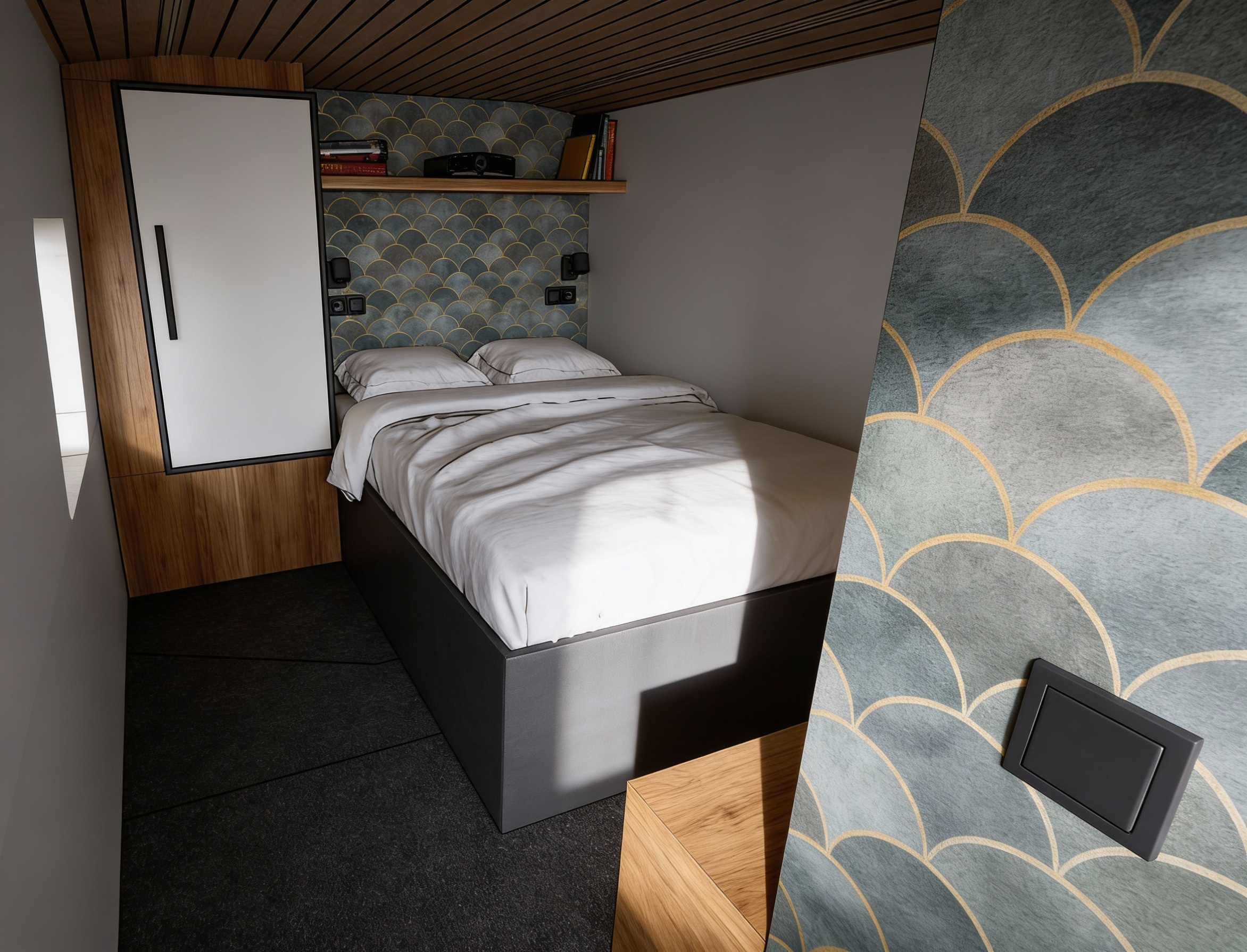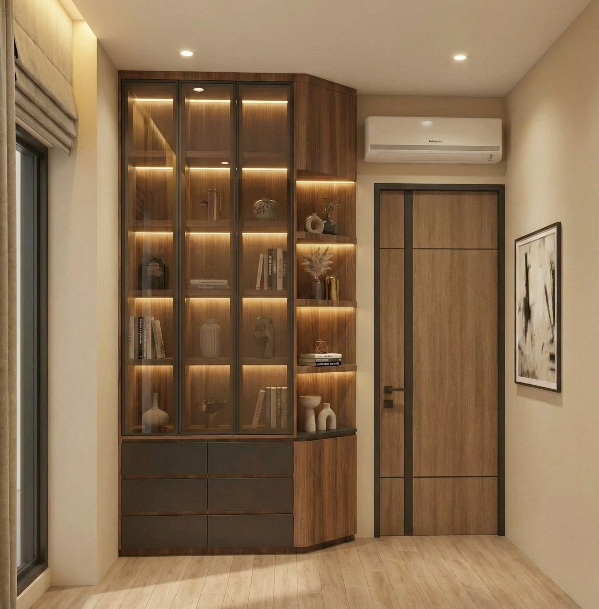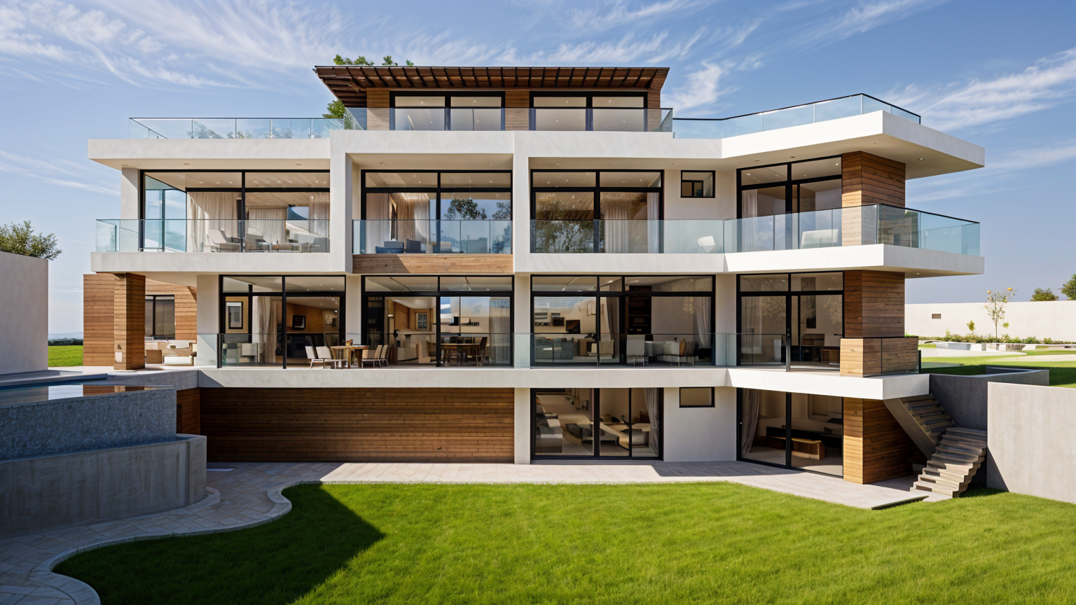 modern minimalist kitchen interior with clean white silk grain kitchen cabinets and light oak decorative elements the dining table is made of light wood with modern metal legs the exact type of dining chairs is iddesign edina design chairitem number 56081t padded beige chairs normal natural light streams in through the large windows illuminating the white slightly marbled floor which is slightly shiny the atmosphere is calm and serene with a touch of sophistication the walls are decorated with soft neutral shades of textile effect wallpaper a contemporary black sculpture adorns a small wooden stand herbs basil parsley in white pots line the windowsill lending a touch of freshness to the space the sofa has a tectil cover slightly wrinkled with naturally placed cushions the wooden furniture and covering elements are light oak in color the quality of the render should be maximum with a realistic effect which is especially noticeable on the textures