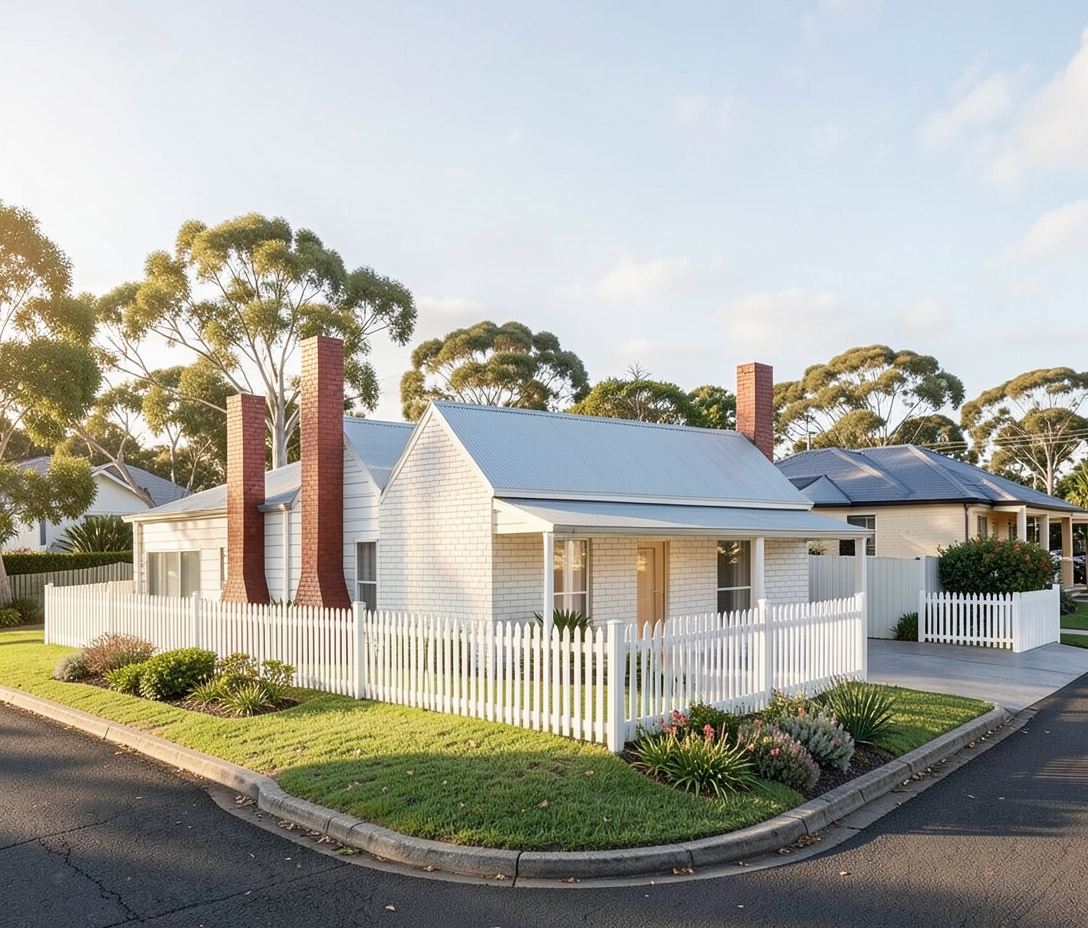 regional town in australia landscape exterior render front of house is a lightly rendered white brick all chimneys the same height white picket fence 1 2 meters high 5 meters away from the front of the house dark grey grey colorbond 1 8 meter high fence down to 1 2 meters at the picket fence 8 meters away from the house on the left remove all roads