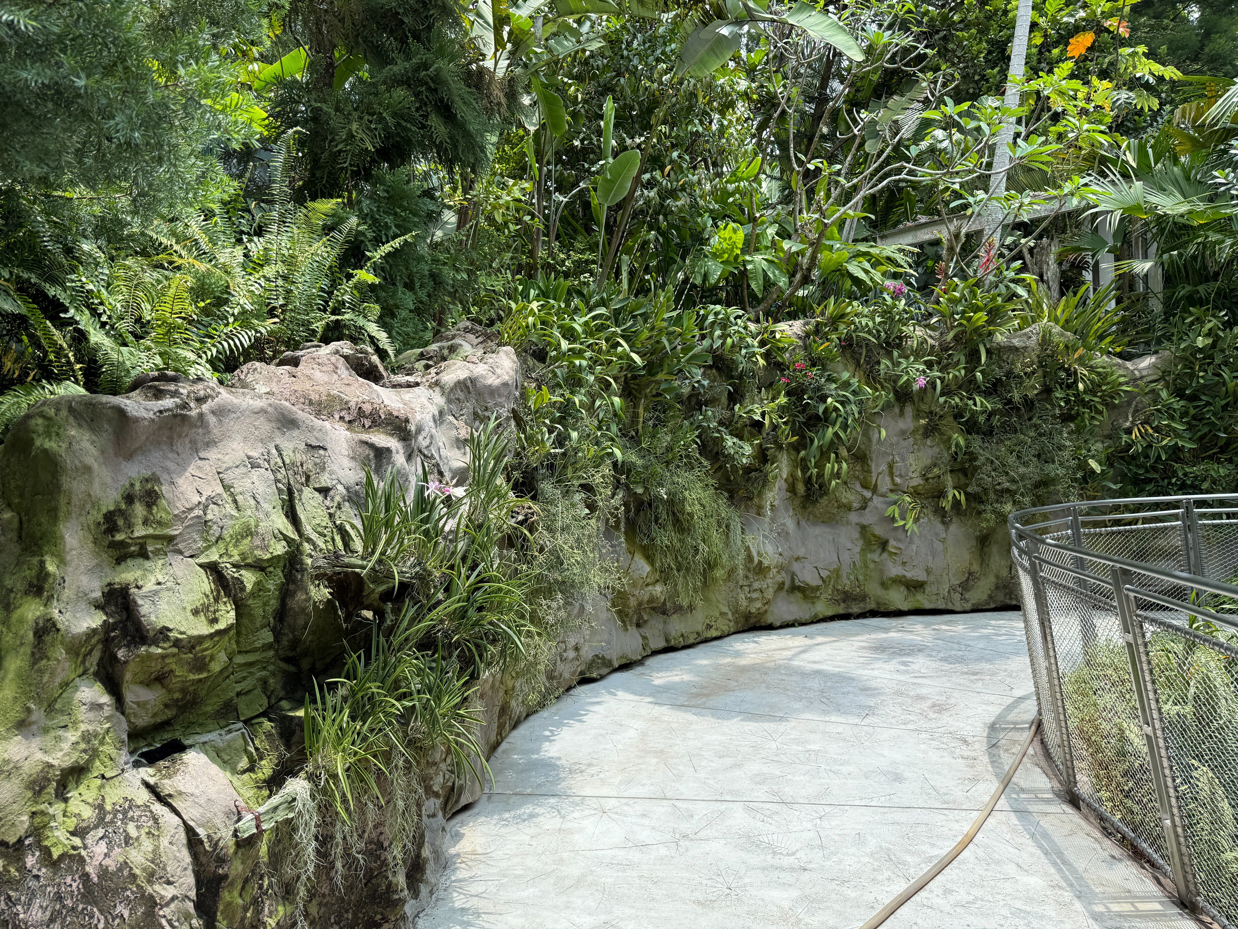 a render of a night installation at the singapore national orchid gardens water light effects are projected onto the ground along the rock wall soft glowing light anemones fill the wall that move when a person stands near them they begin to fade and dim around that area