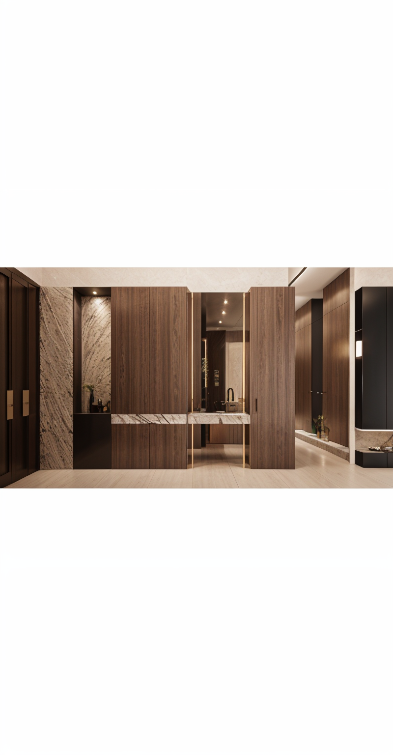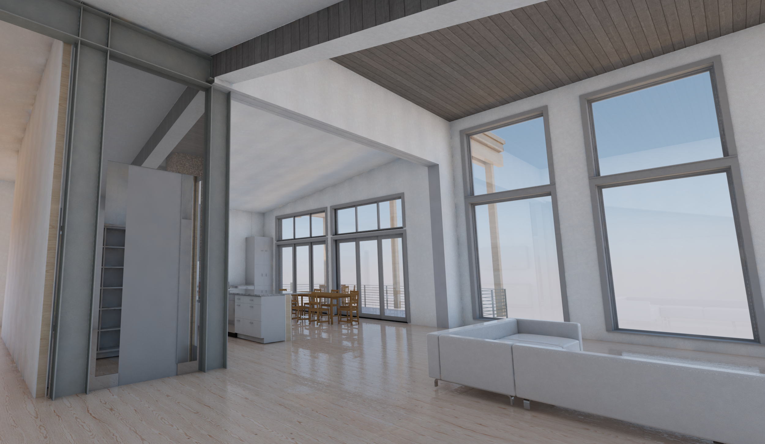 ski house party with snowy mountains and pine forest out the windows glass wine cellar in the foreground on the left with dining room beyond with table set for a party fireplace glow from off screen on the right at sunset