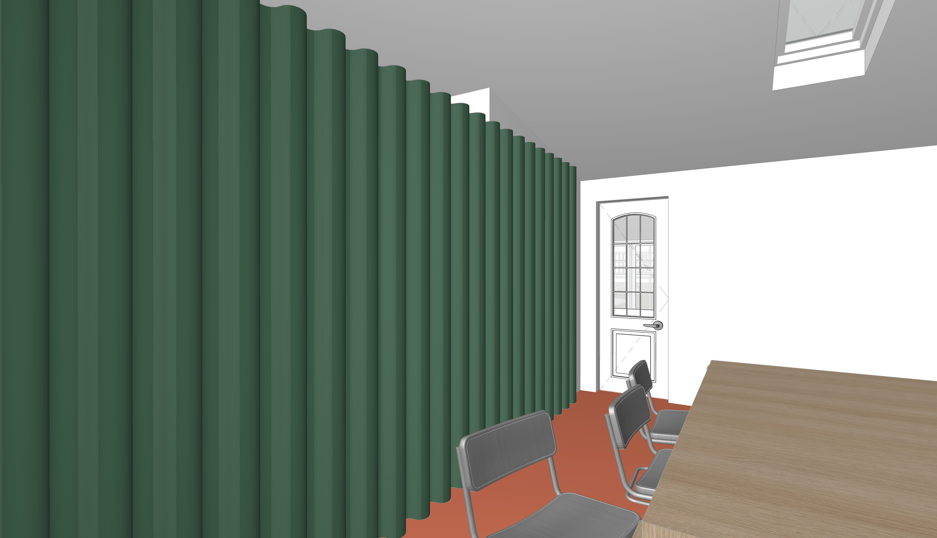 the green surface is a velvety curtain and the floor is a coral carpet