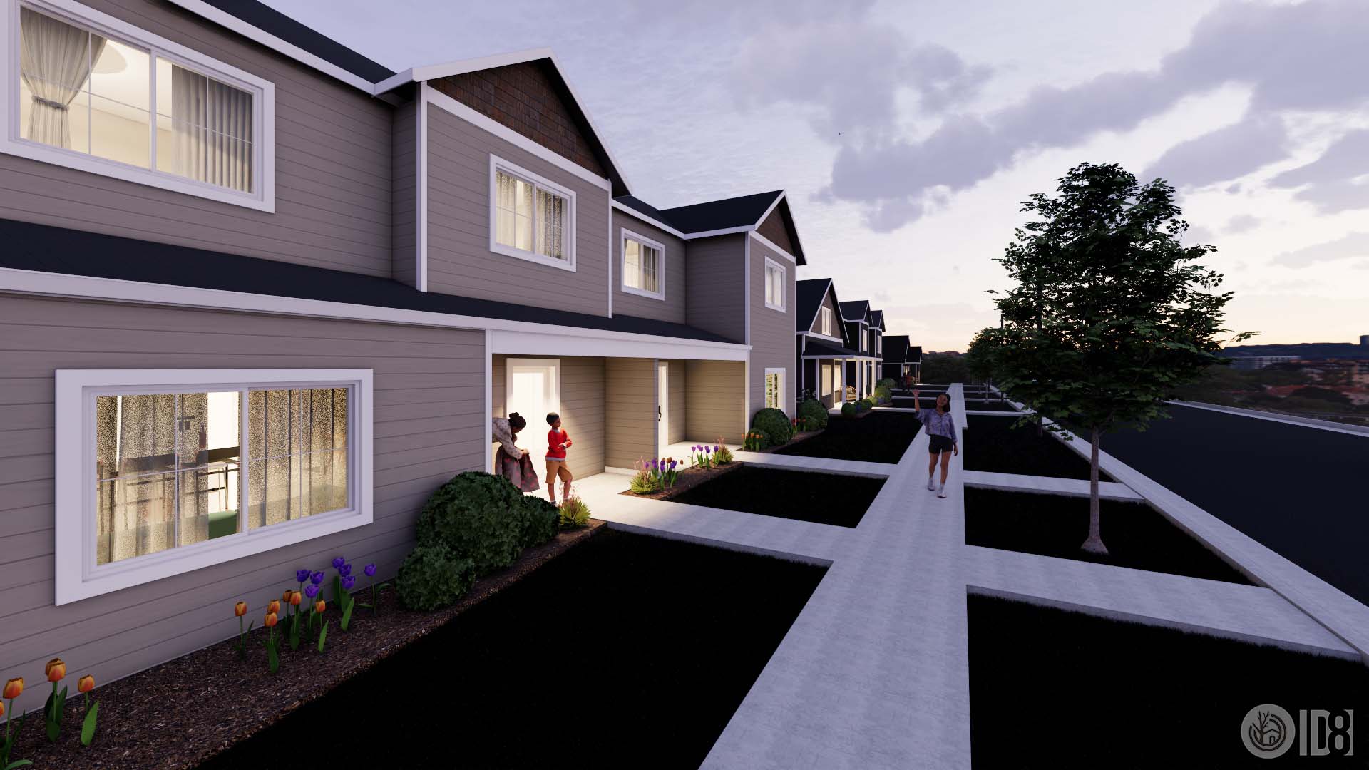 make this neighborhood rendering more realistic and include realistic trees people and a car driving down the street