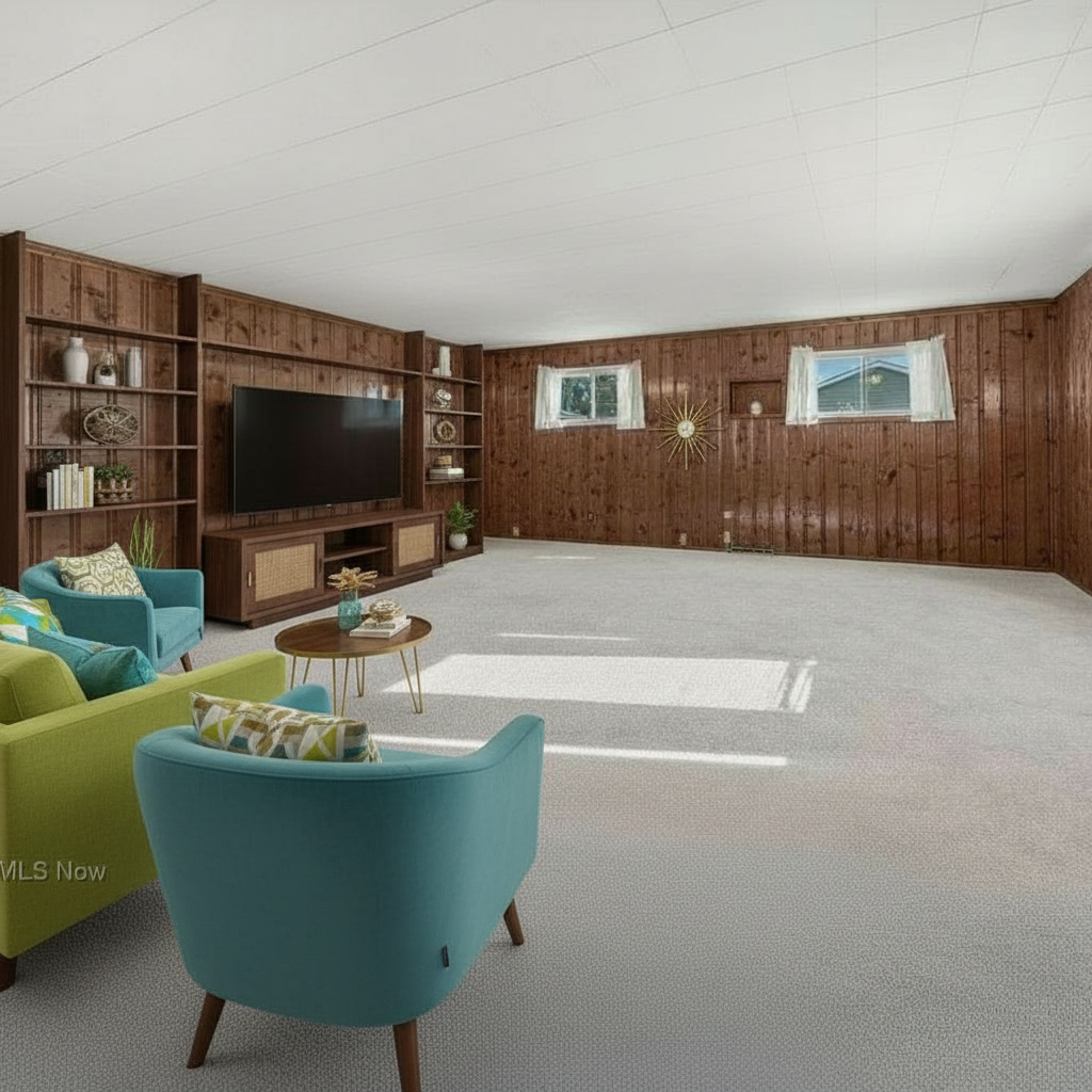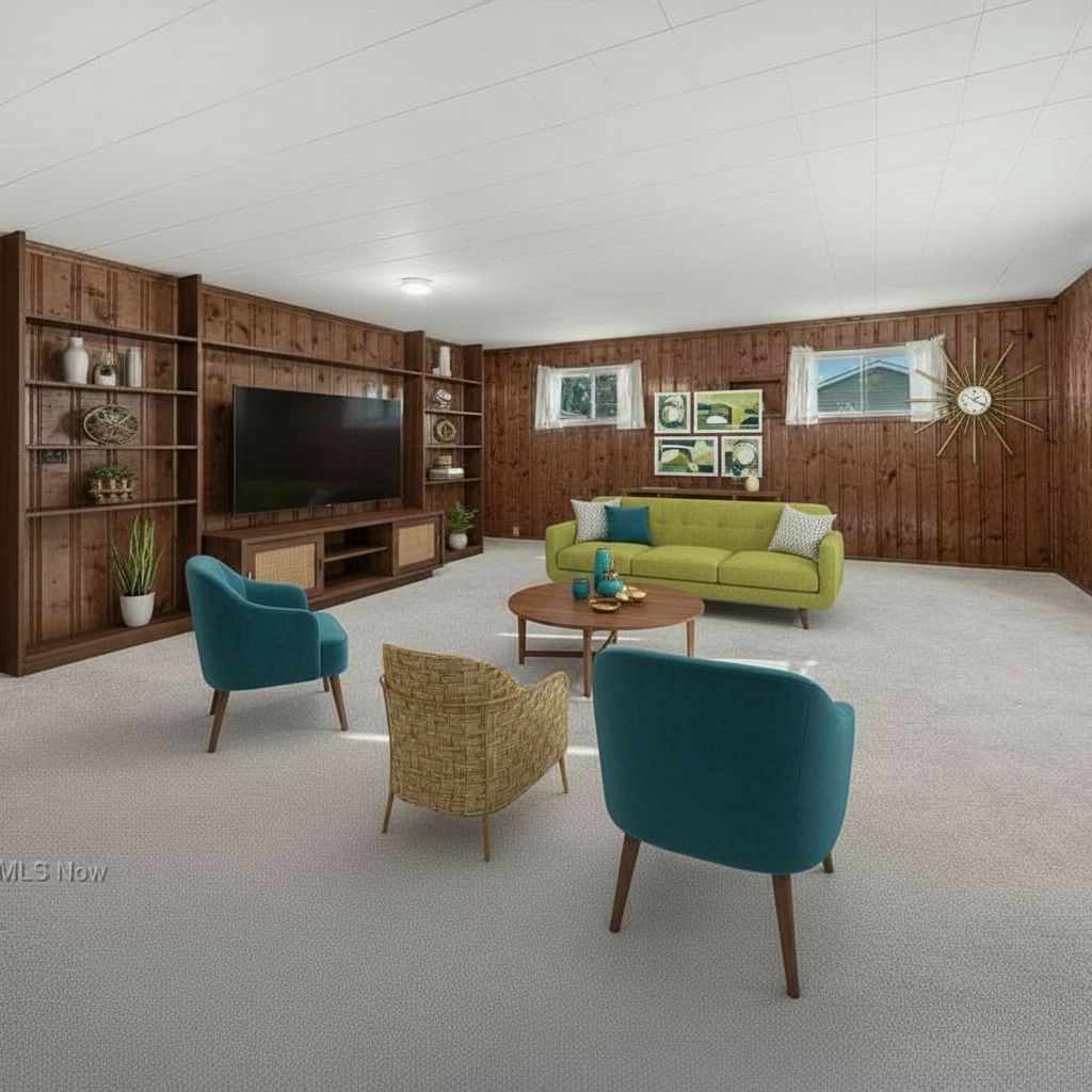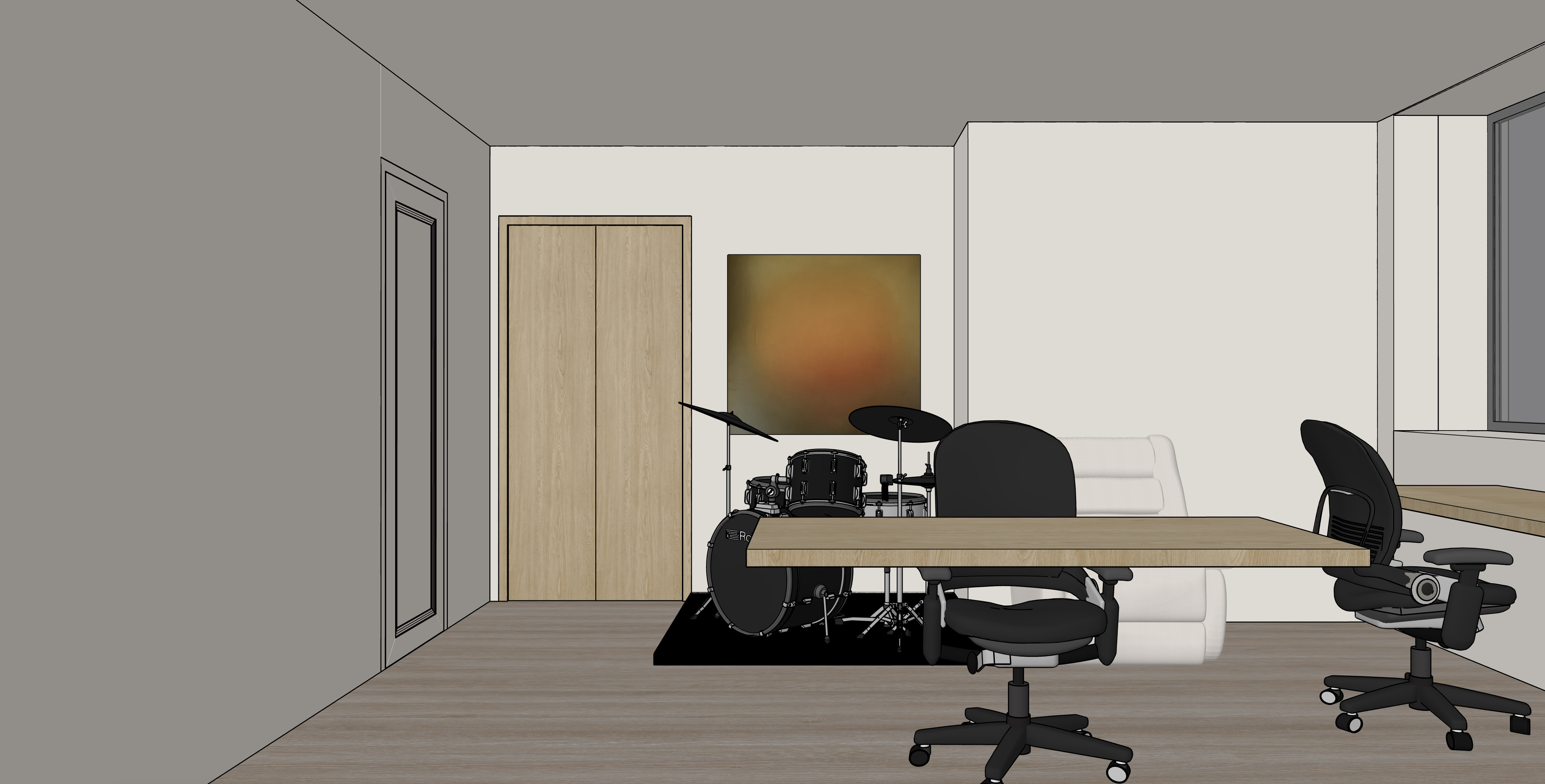 warm interior lighting make ths study vibey the wall art is a wall light that lights up and casts the room in a sunset glow add in studio display on the desk in front add a wall lamp next to the armchair add in a ceiling fan on top add handles on the doors