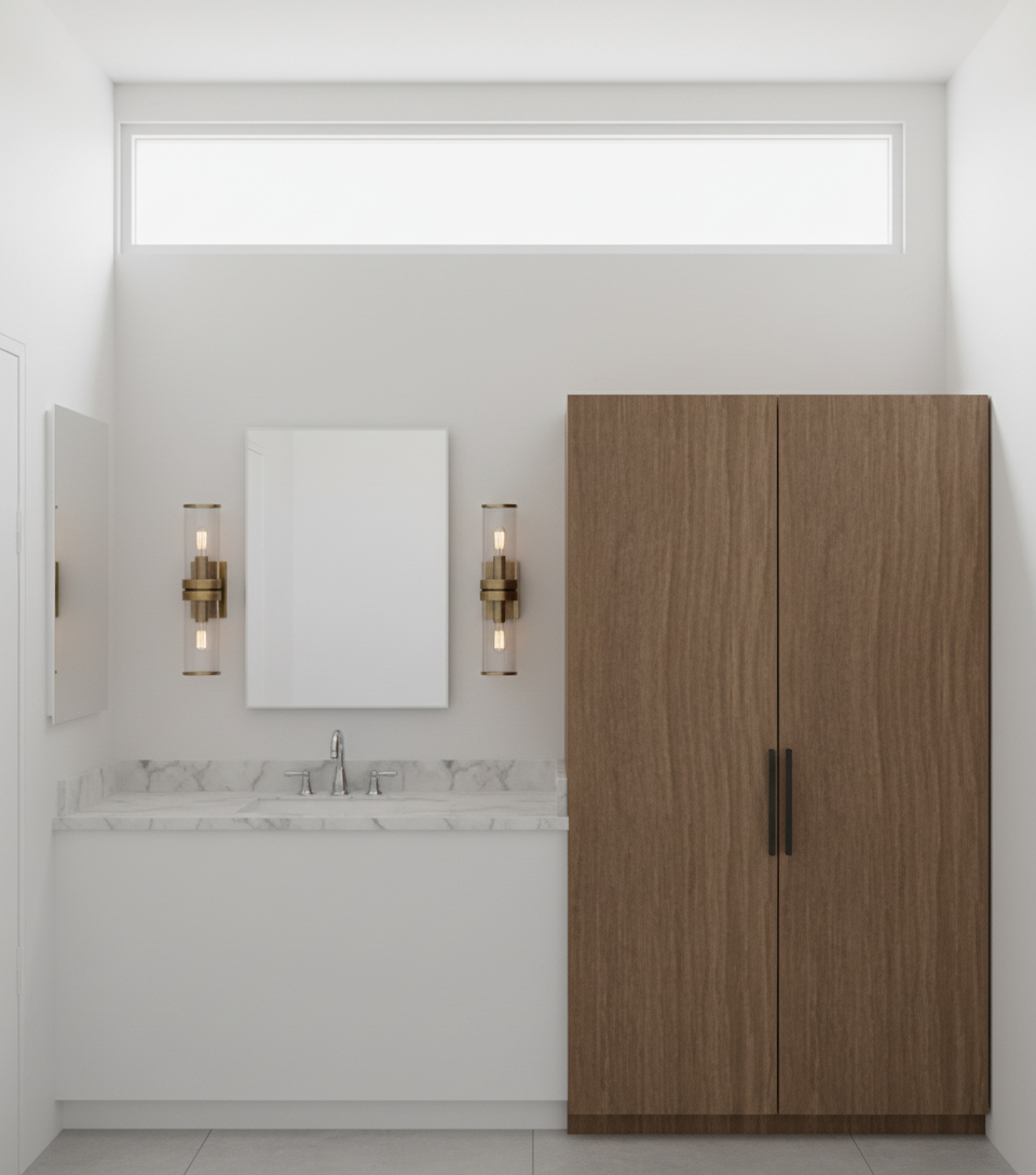 create a realistic and beautifully rendered image of a classic kitchen the left cabinets are classic white with glass panels reflecting a soft light the countertops are a polished white marble with subtle gray veining the cabinetry on the right is finished in a caramel mid tone maple with light grey tones enhanced by under cabinet lighting that casts a gentle glow the refrigerator has a sleek stainless steel finish adding a contemporary touch the walls are painted in a soft dove white creating a calm and inviting atmosphere the overall lighting is warm and ambient evoking a cozy and elegant atmosphere